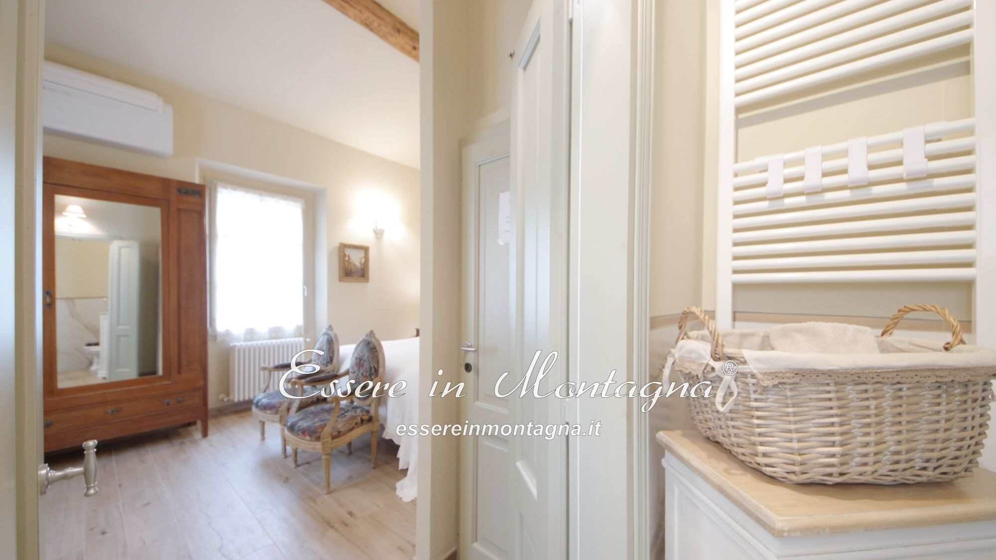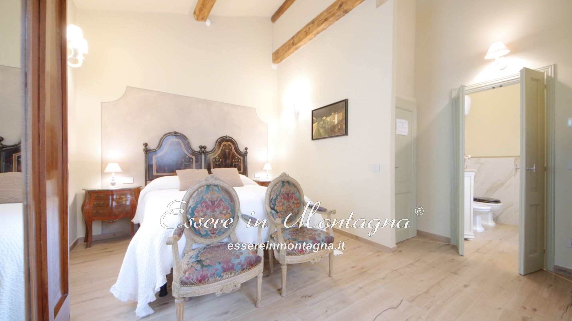 Al piano superiore trovi tre camere mansardate (altezza media 3.5ml), ognuna con bagno privato e sanitari in stile d’epoca, con suggestivi travi originali a vista.