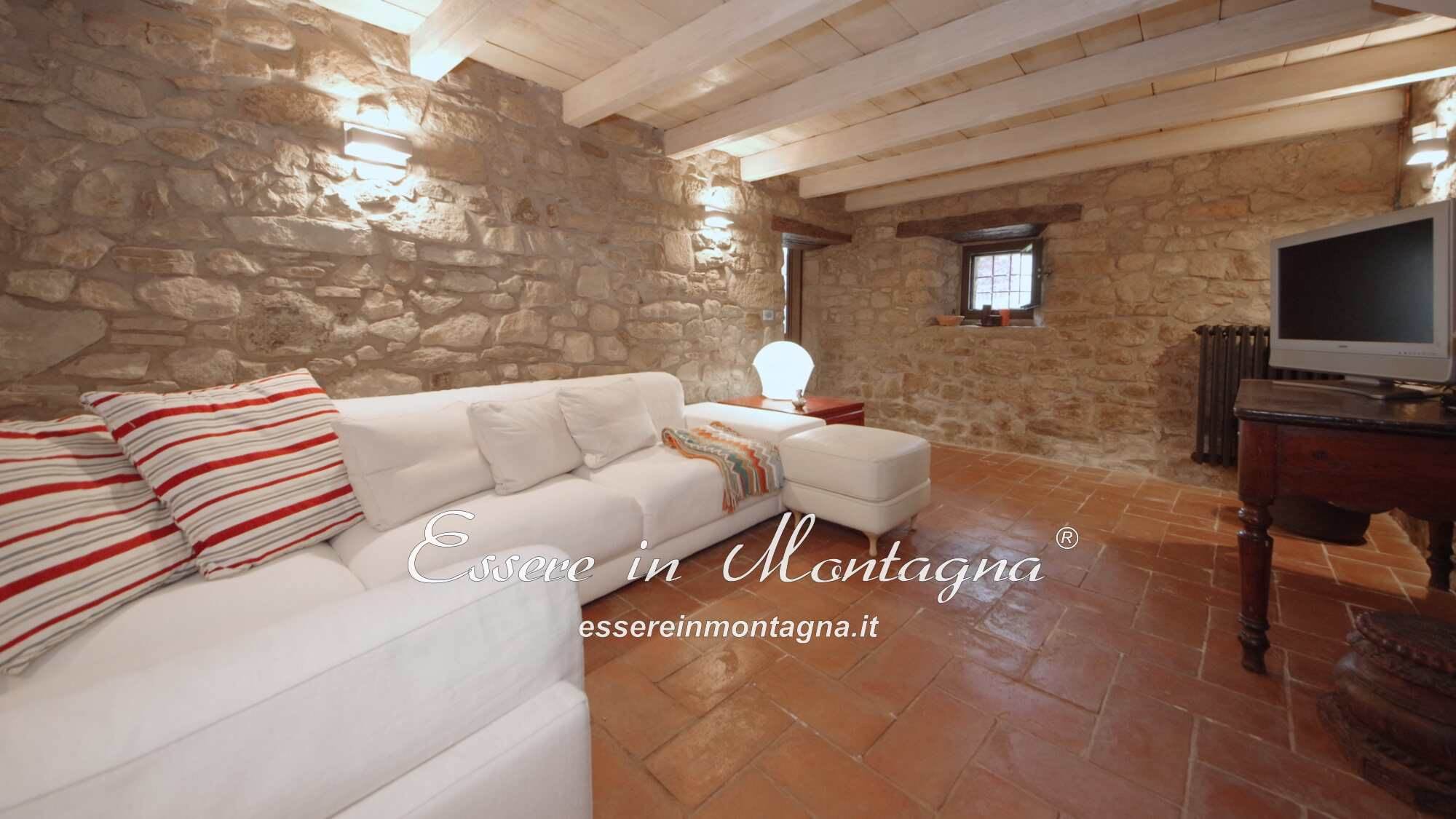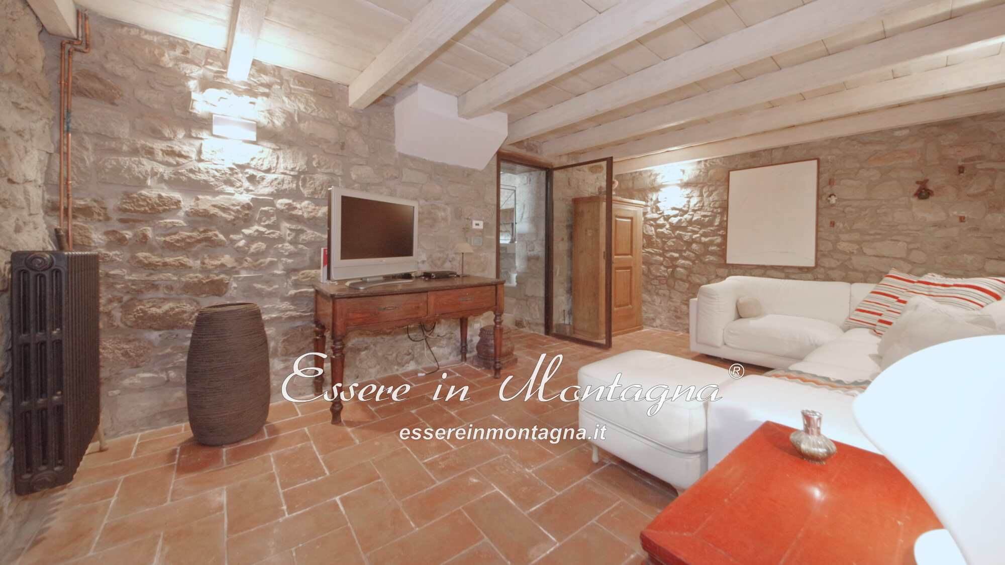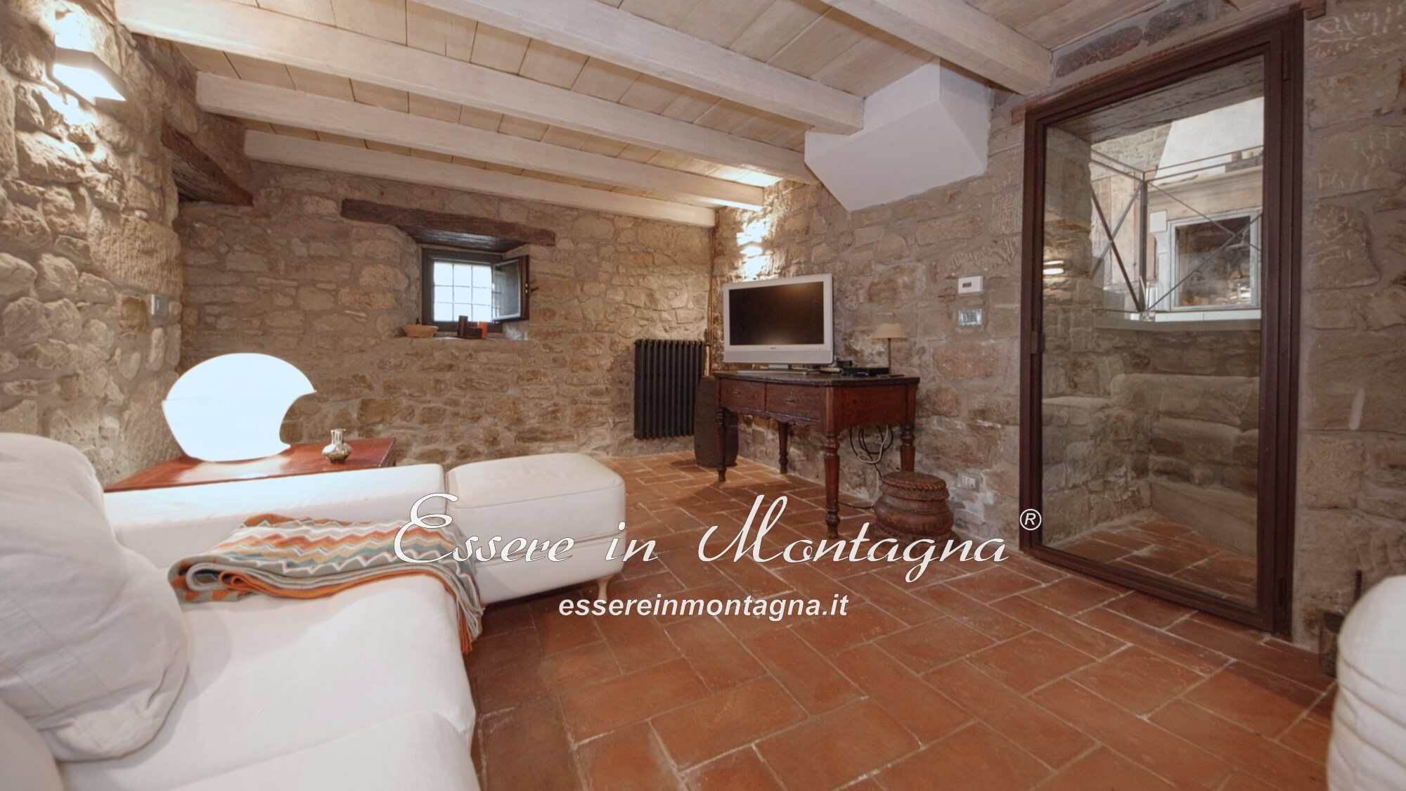 Una porticina interna porta a una stanza più raccolta, con poca luce naturale, che Giulia usa come home theatre. Pavimento in cotto, muri in sasso, soffitti in legno dipinti di bianco: tutto parla di autenticità, ricercatezza e bellezza.