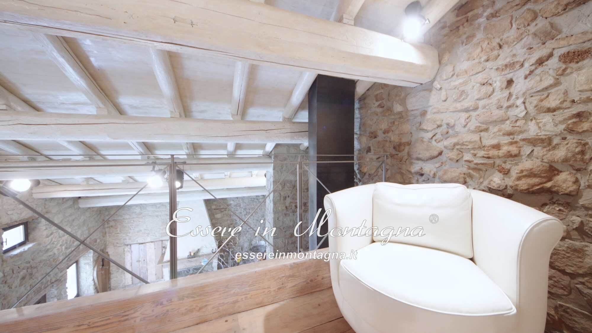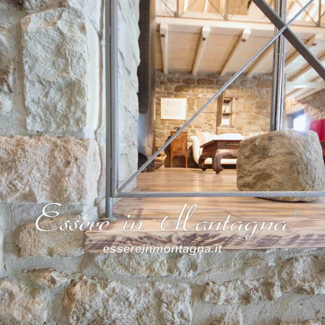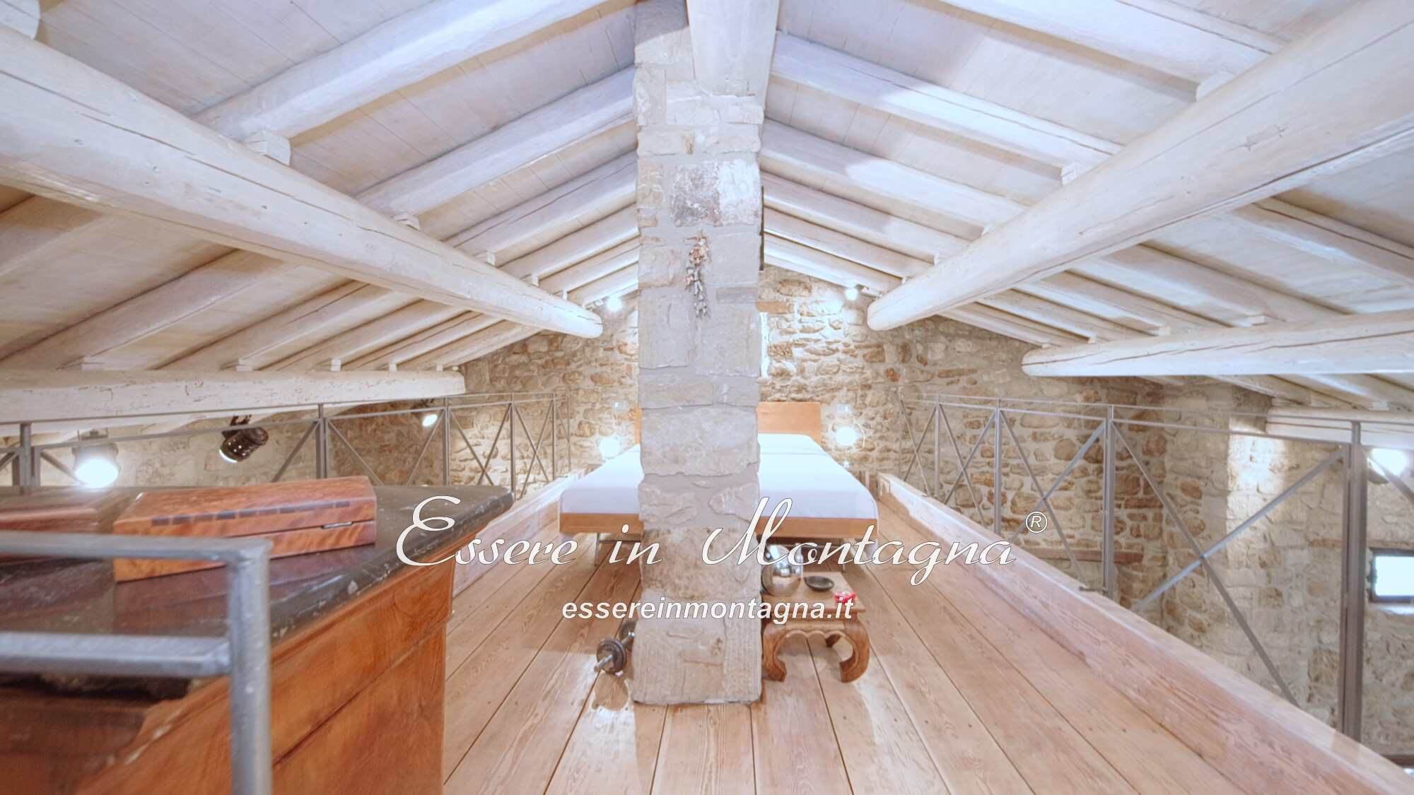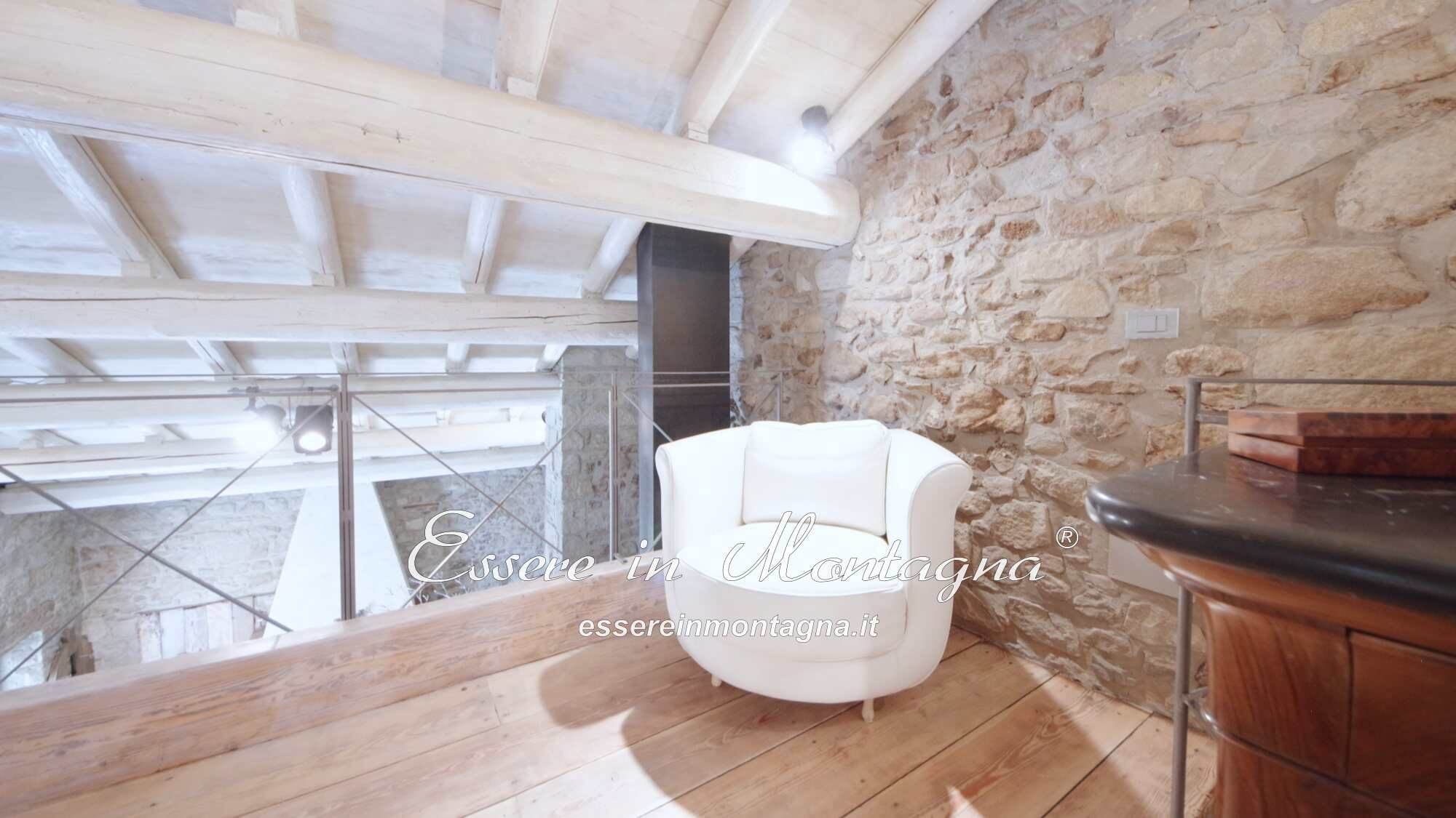 Proseguo nella stanza accanto, di passaggio ma tutt’altro che anonima: pavimento in legno, tetto a vista, pareti in sasso, un tavolo a muro con sedie importanti. Due porte conducono a una stanza oggi usata come camera e a un bagno con doccia in cristallo. Una scala in legno antico porta al soppalco. E ovviamente… ci salgo.