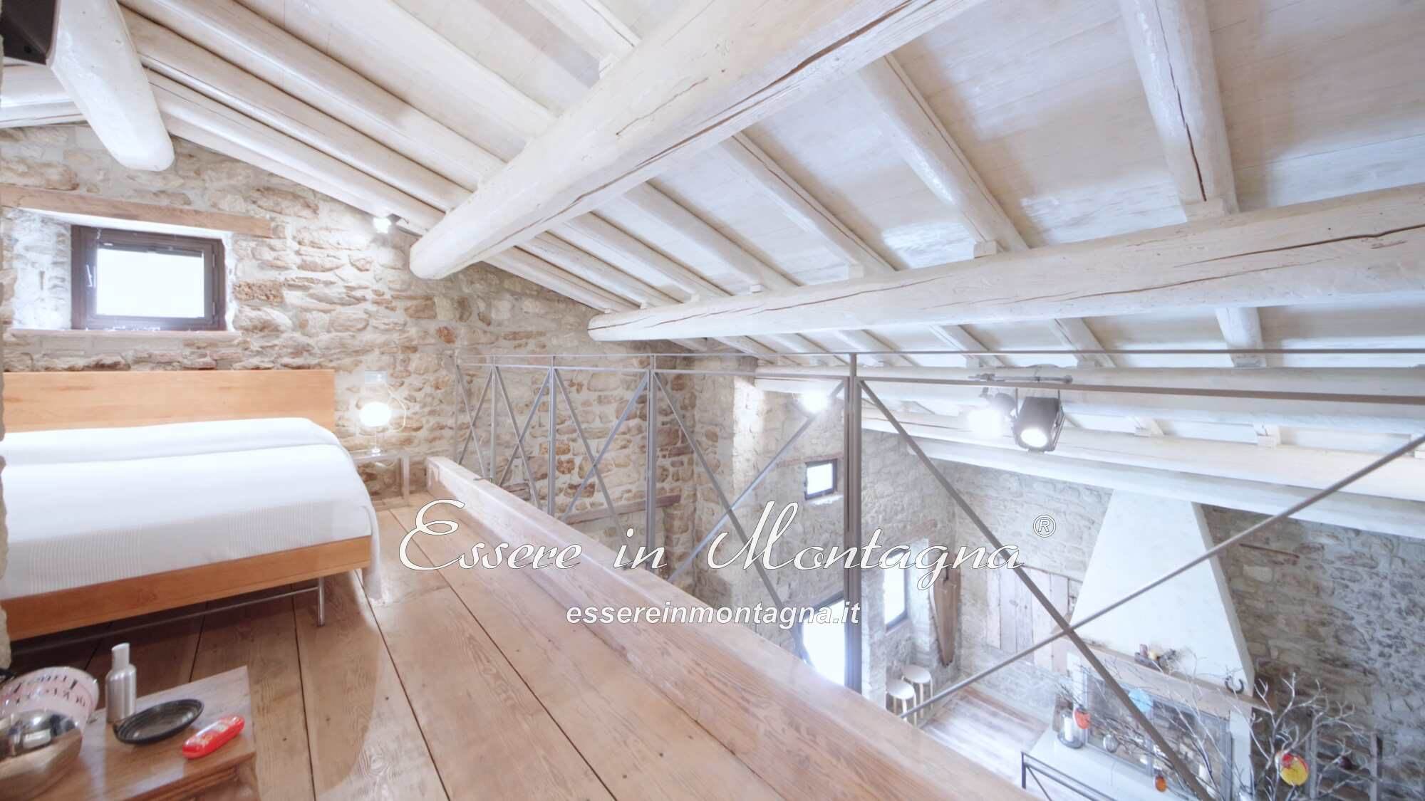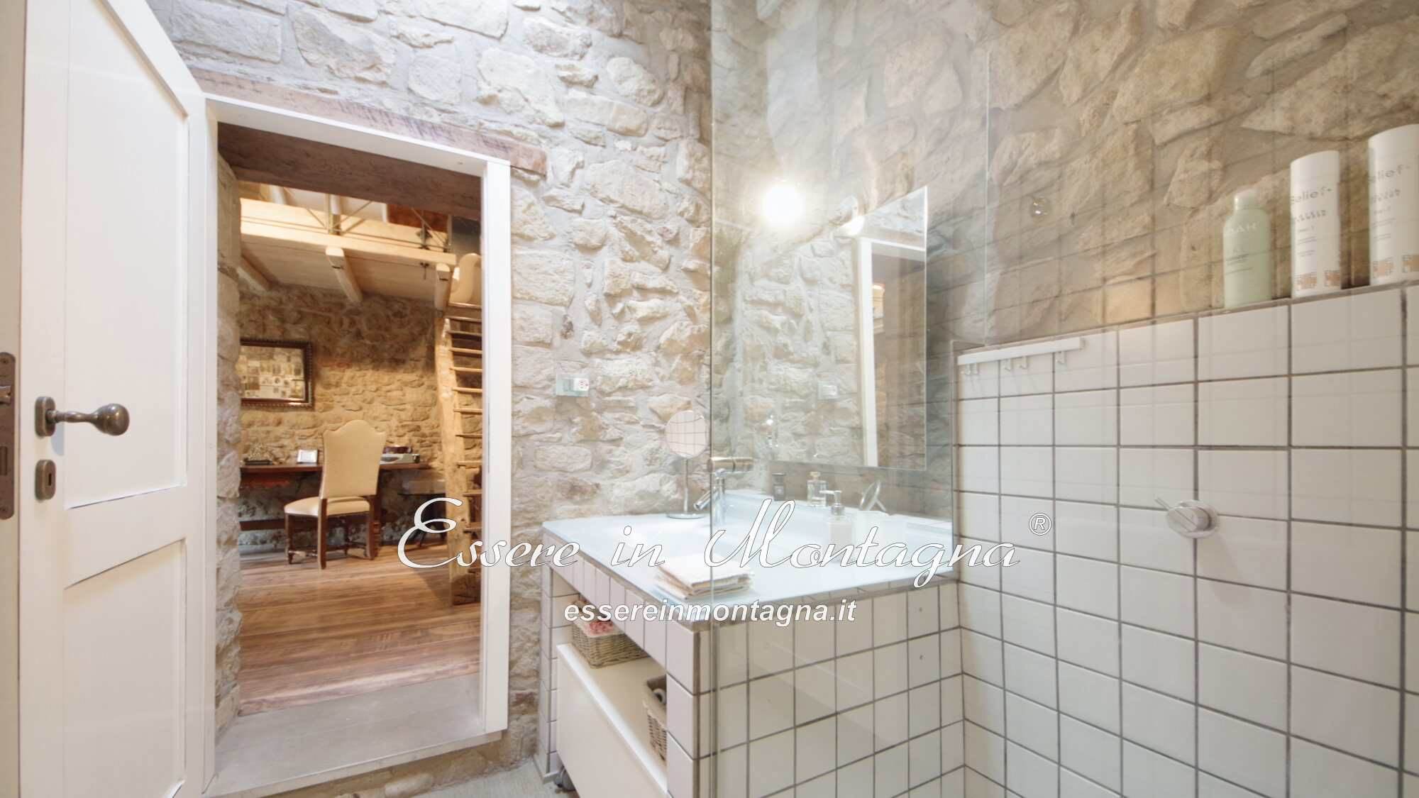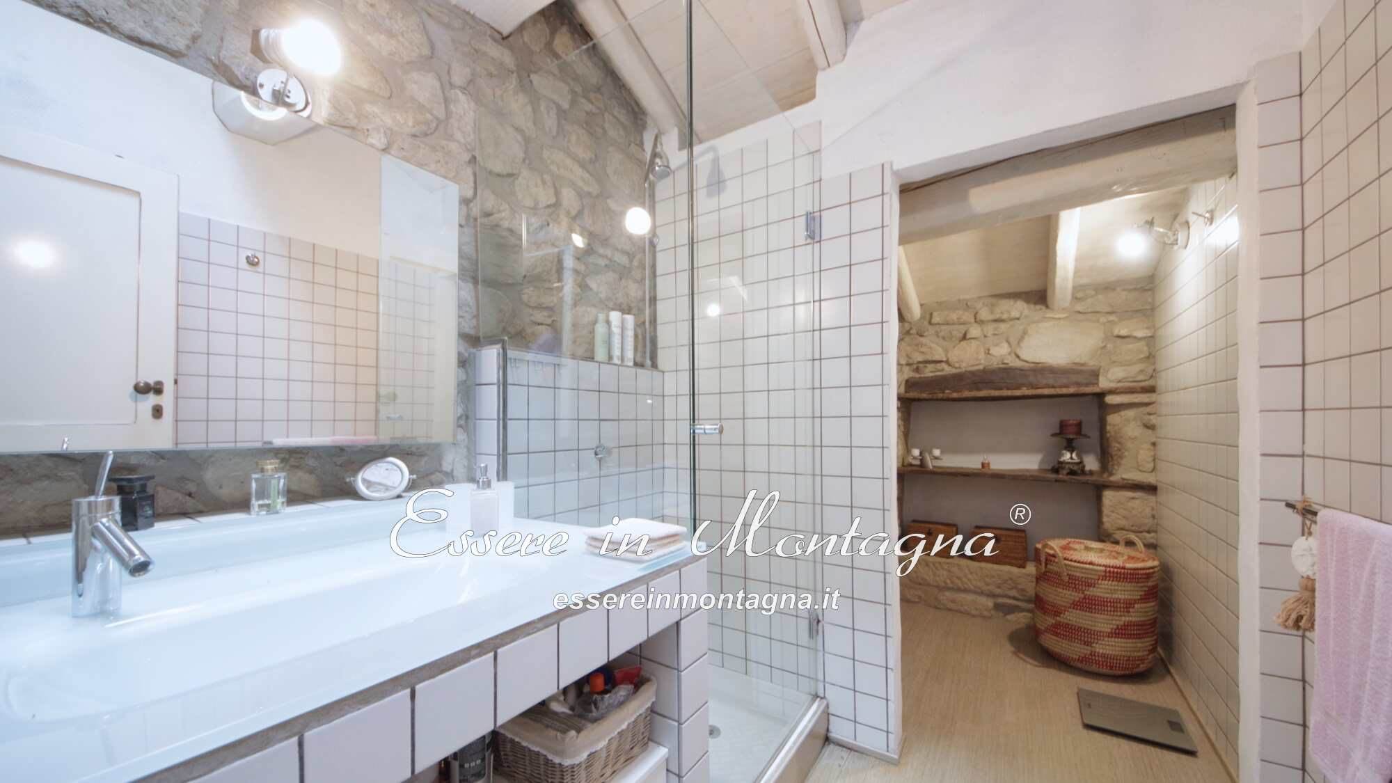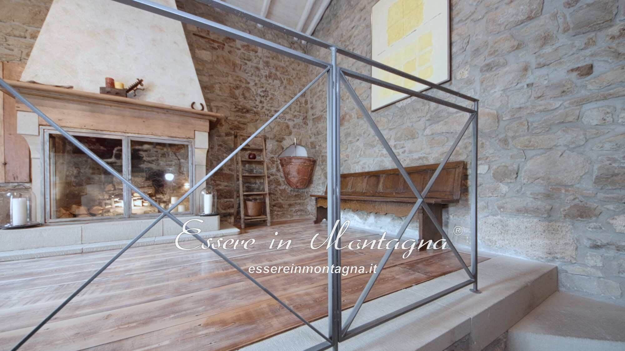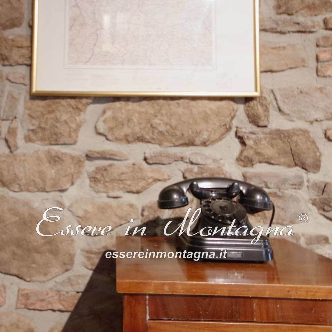 Proseguo nella stanza accanto, di passaggio ma tutt’altro che anonima: pavimento in legno, tetto a vista, pareti in sasso, un tavolo a muro con sedie importanti. Due porte conducono a una stanza oggi usata come camera e a un bagno con doccia in cristallo. Una scala in legno antico porta al soppalco. E ovviamente… ci salgo.