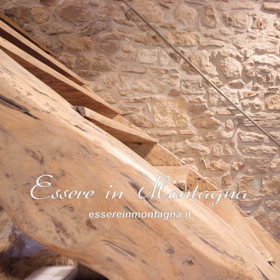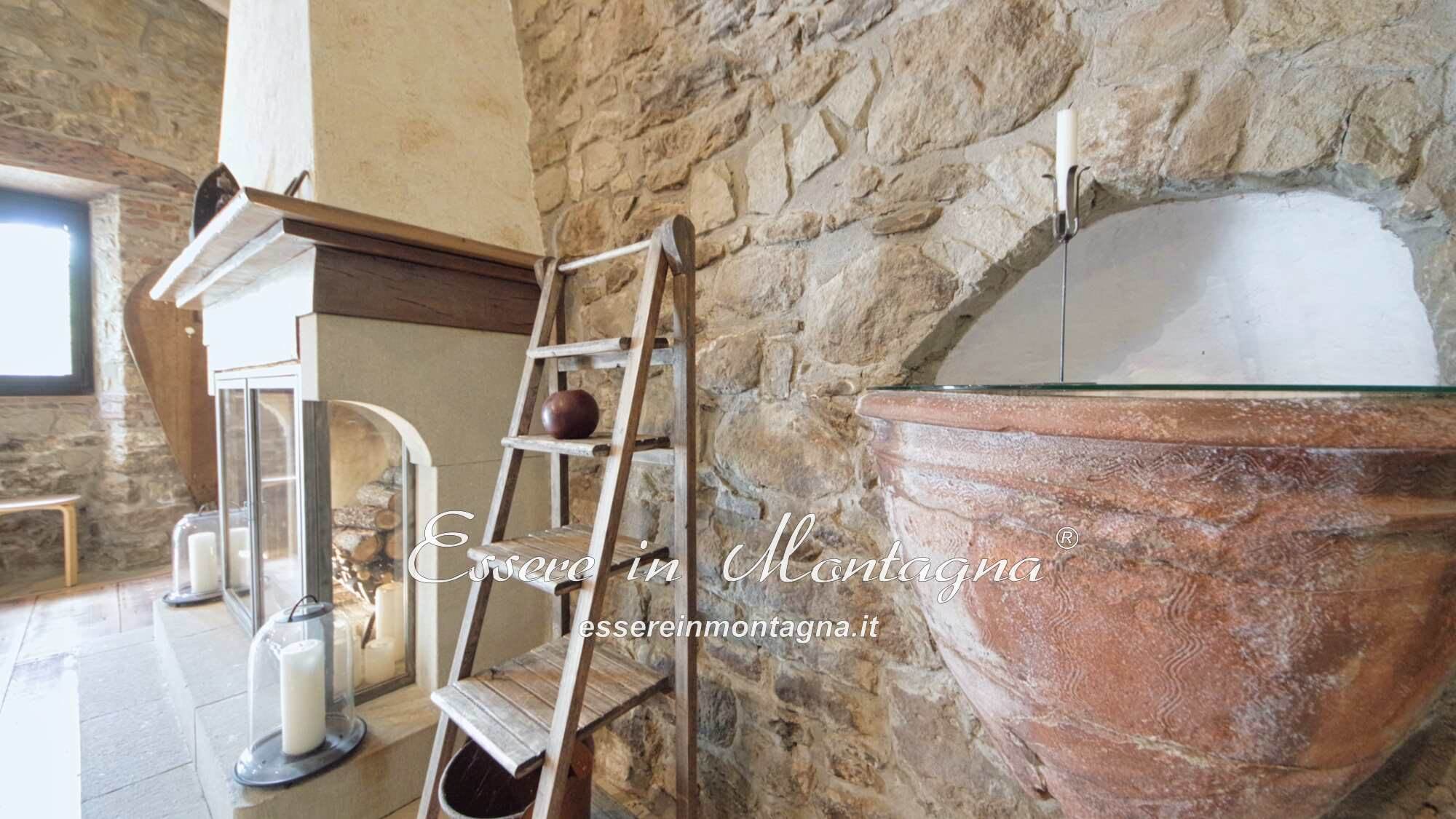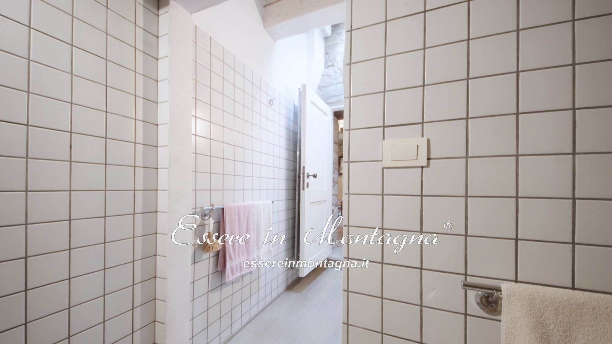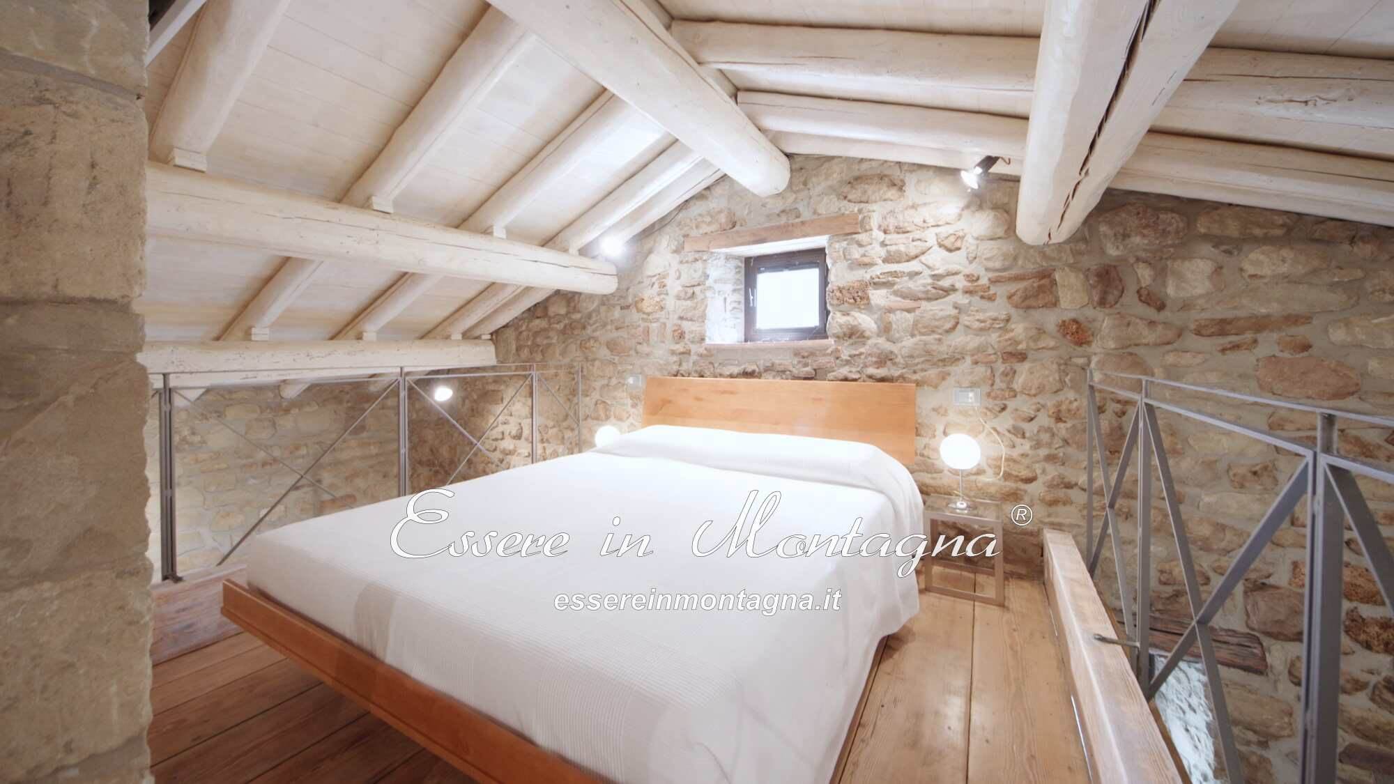 Proseguo nella stanza accanto, di passaggio ma tutt’altro che anonima: pavimento in legno, tetto a vista, pareti in sasso, un tavolo a muro con sedie importanti. Due porte conducono a una stanza oggi usata come camera e a un bagno con doccia in cristallo. Una scala in legno antico porta al soppalco. E ovviamente… ci salgo.