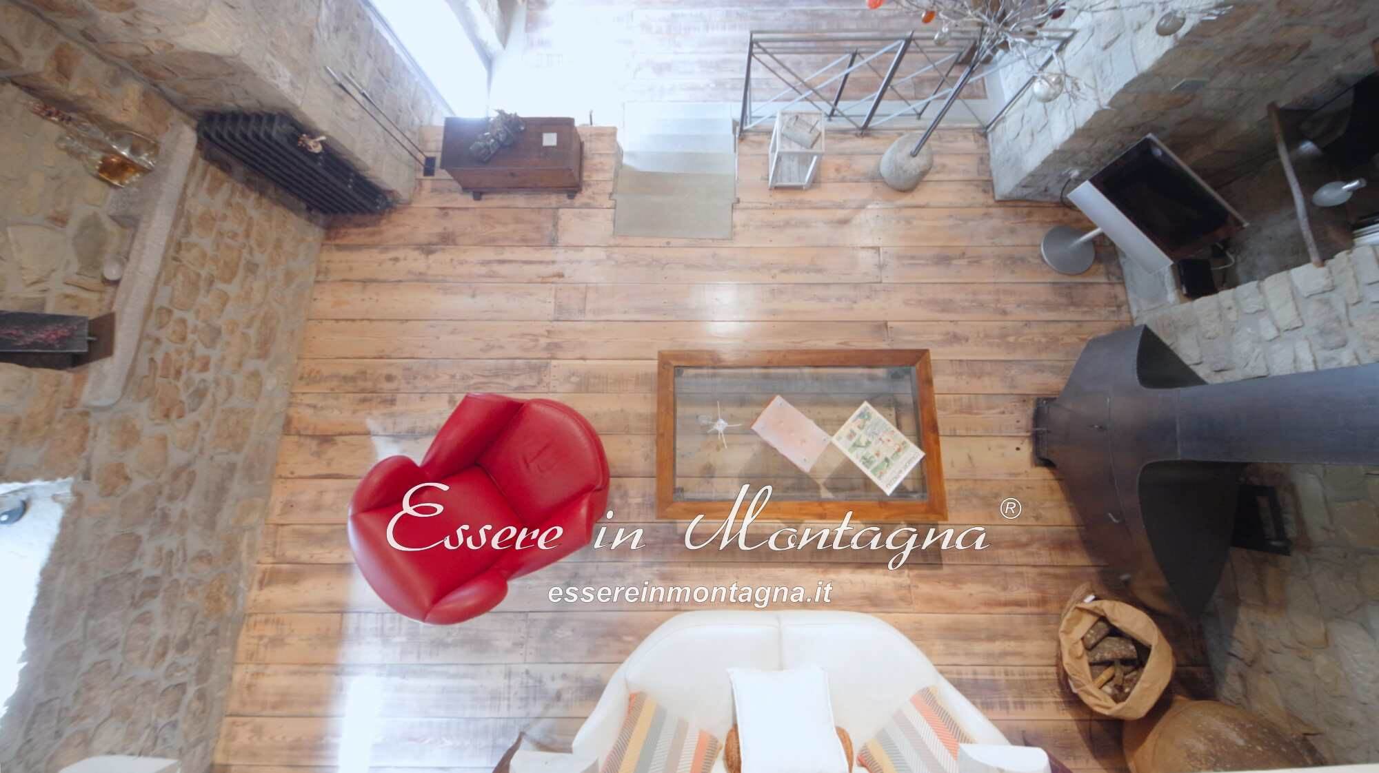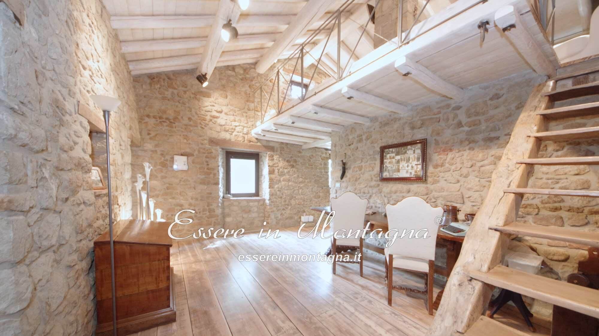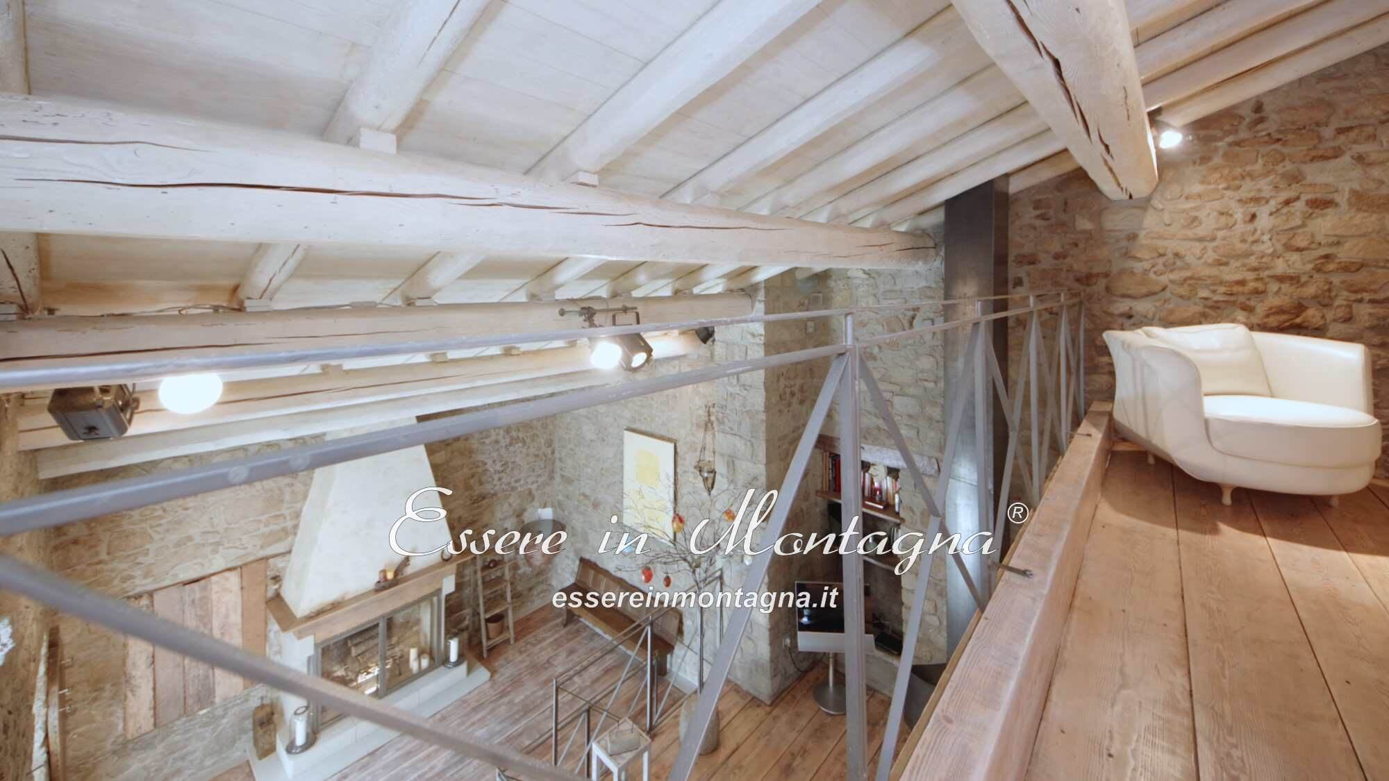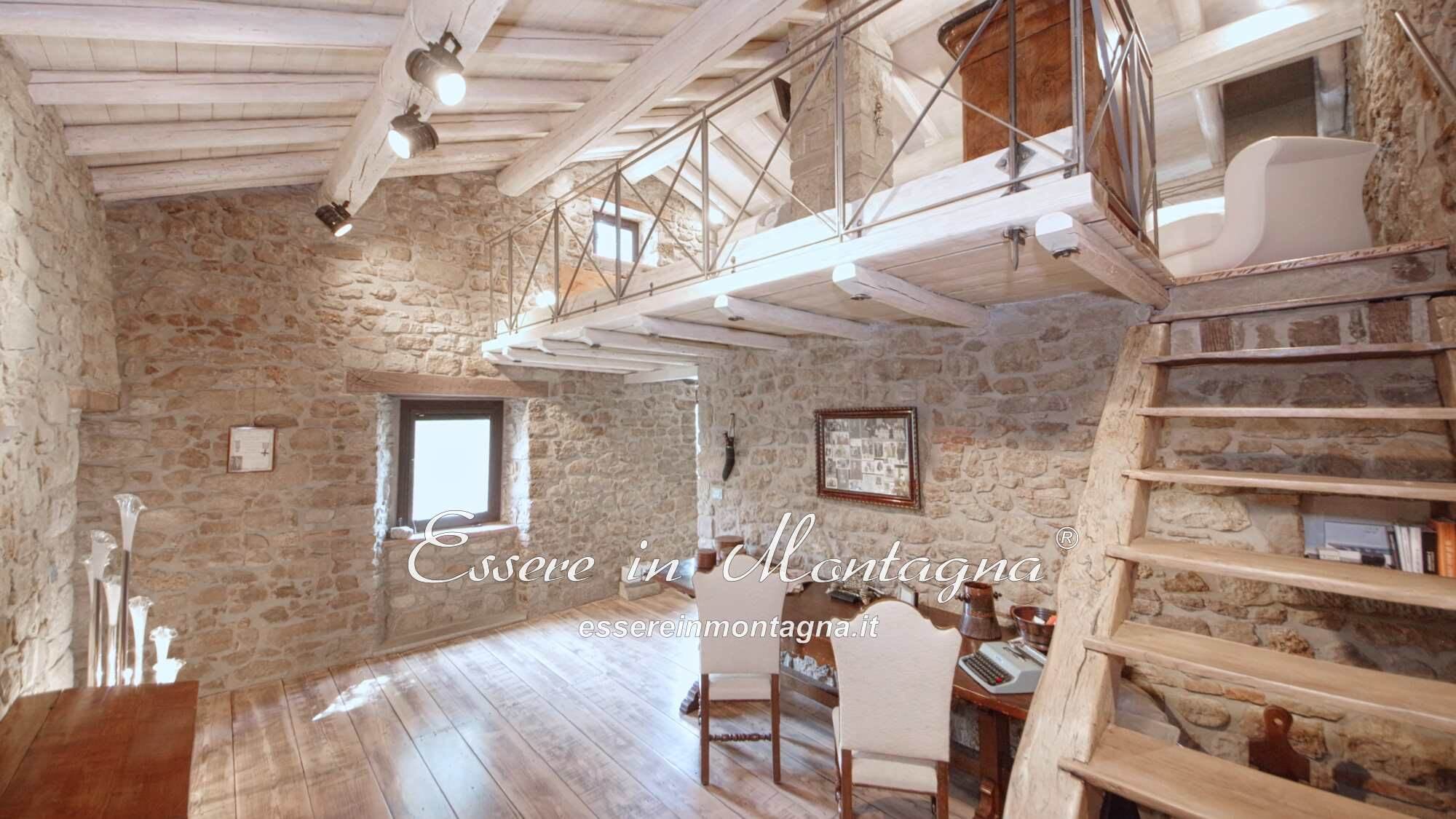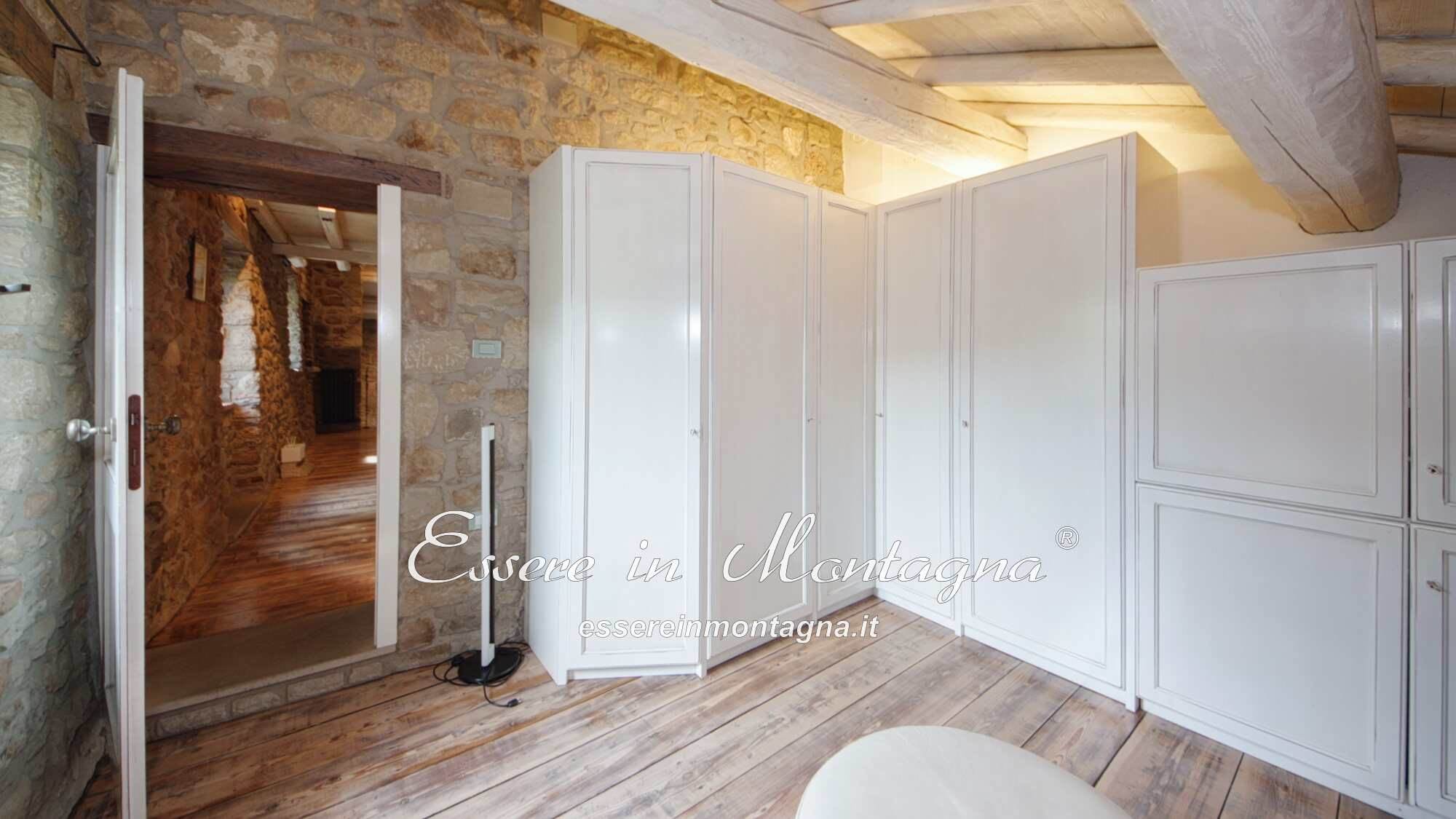 Proseguo nella stanza accanto, di passaggio ma tutt’altro che anonima: pavimento in legno, tetto a vista, pareti in sasso, un tavolo a muro con sedie importanti. Due porte conducono a una stanza oggi usata come camera e a un bagno con doccia in cristallo. Una scala in legno antico porta al soppalco. E ovviamente… ci salgo.