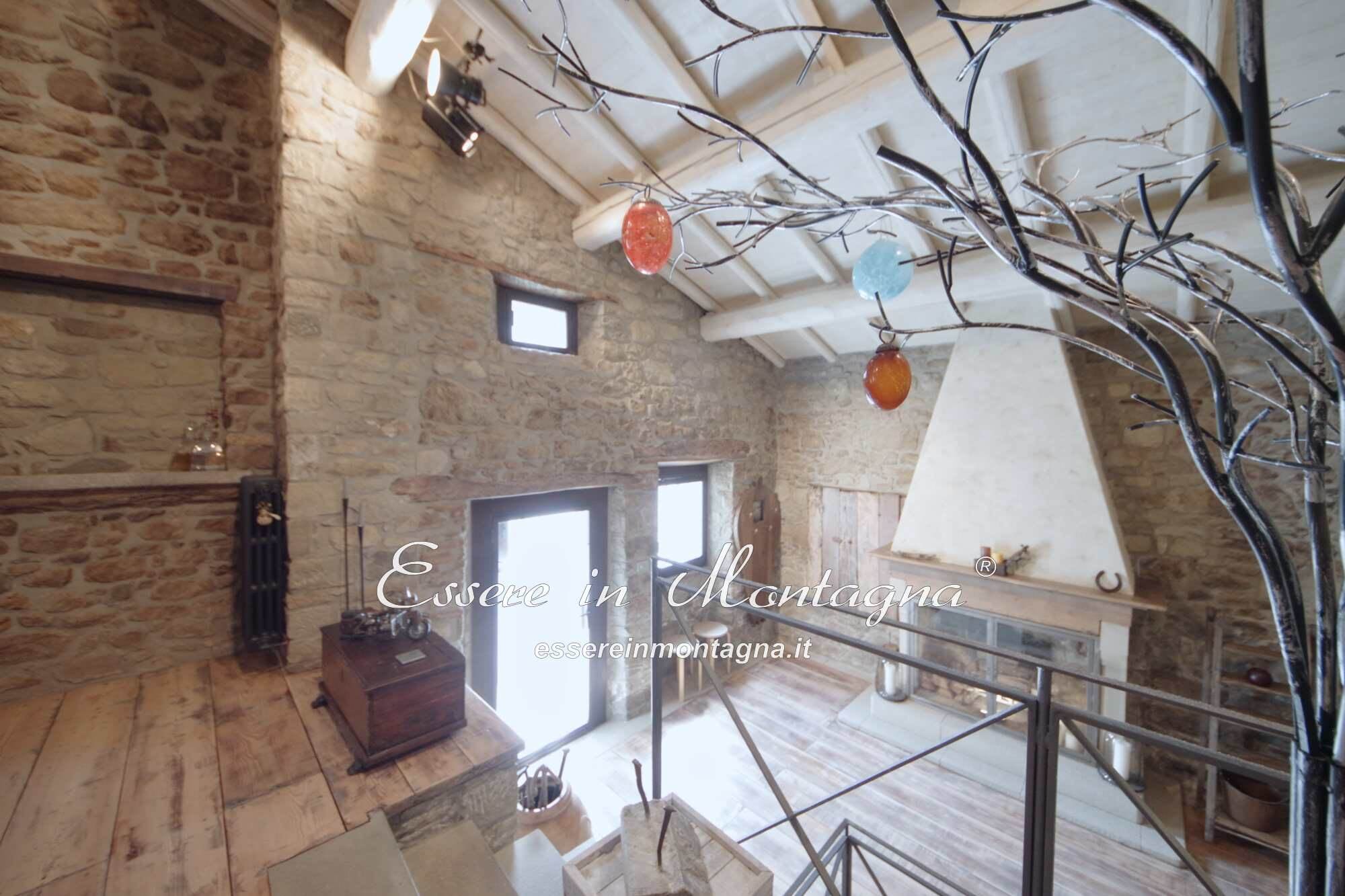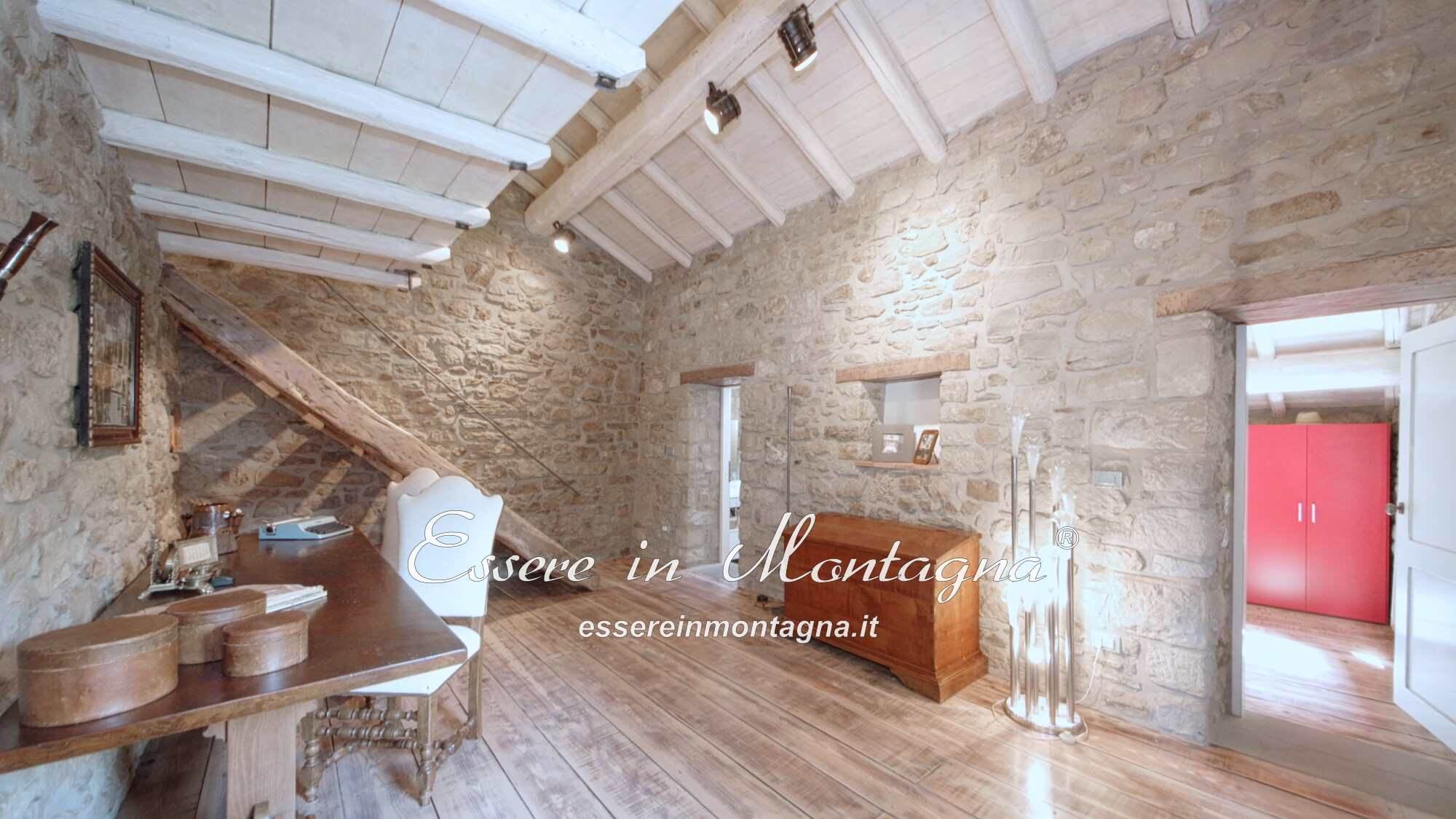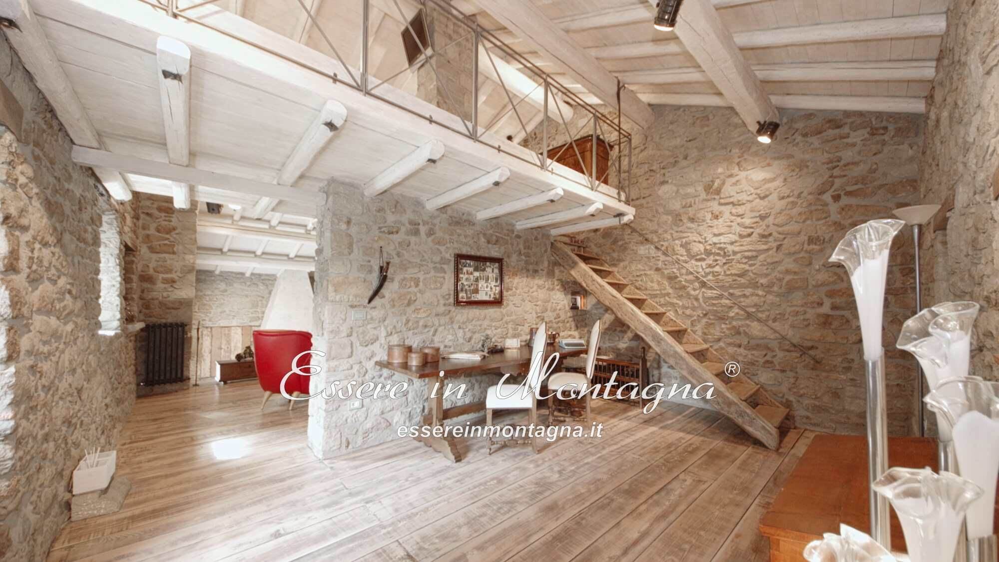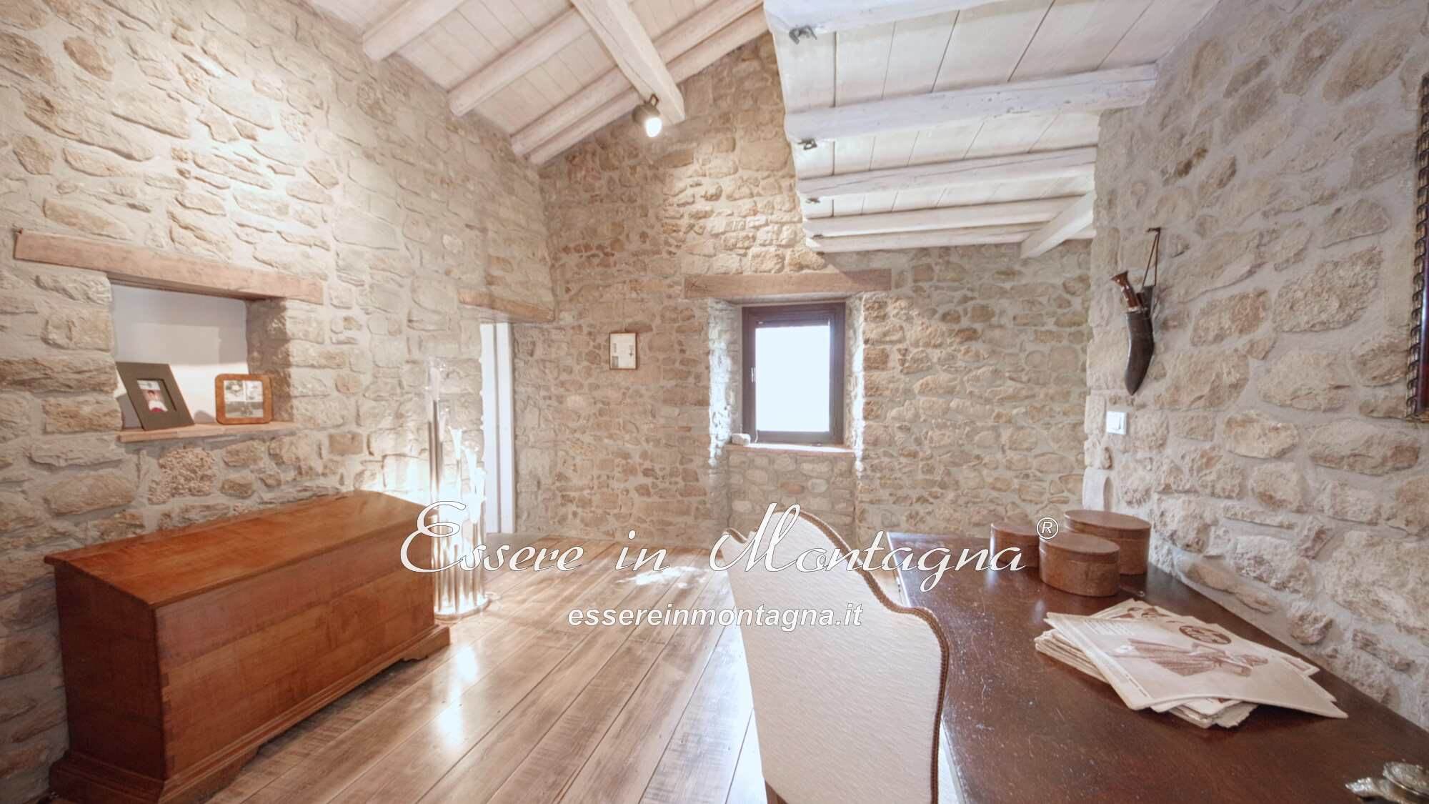 Proseguo nella stanza accanto, di passaggio ma tutt’altro che anonima: pavimento in legno, tetto a vista, pareti in sasso, un tavolo a muro con sedie importanti. Due porte conducono a una stanza oggi usata come camera e a un bagno con doccia in cristallo. Una scala in legno antico porta al soppalco. E ovviamente… ci salgo.