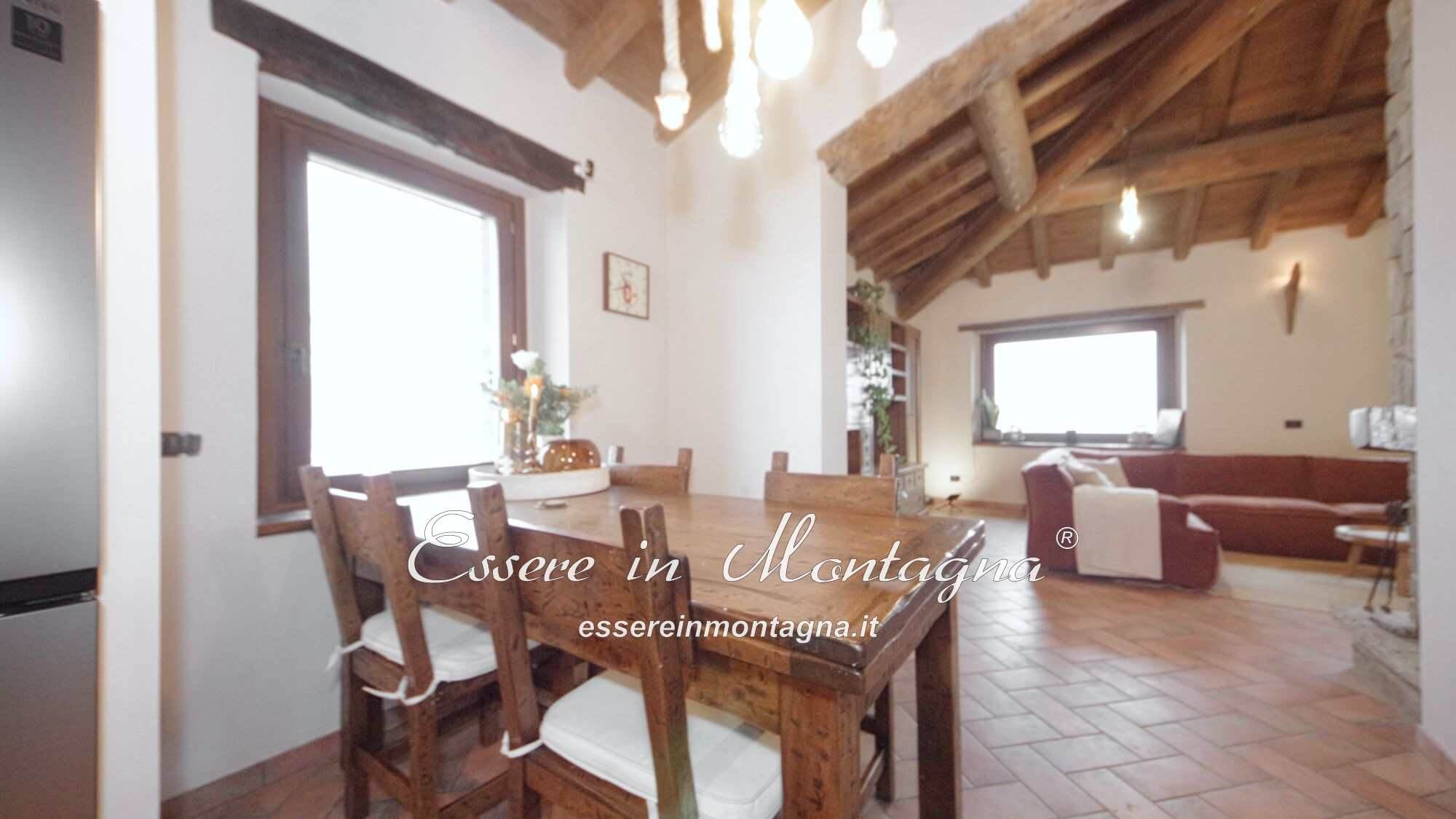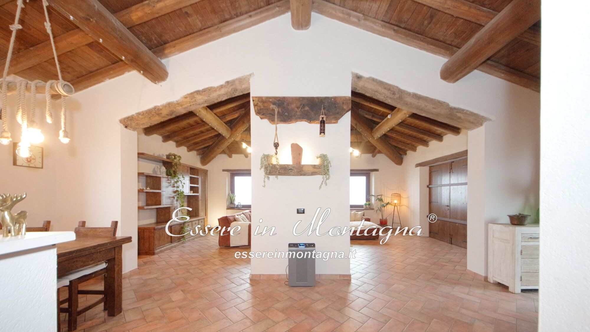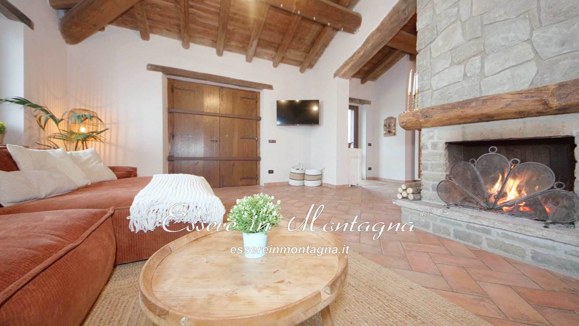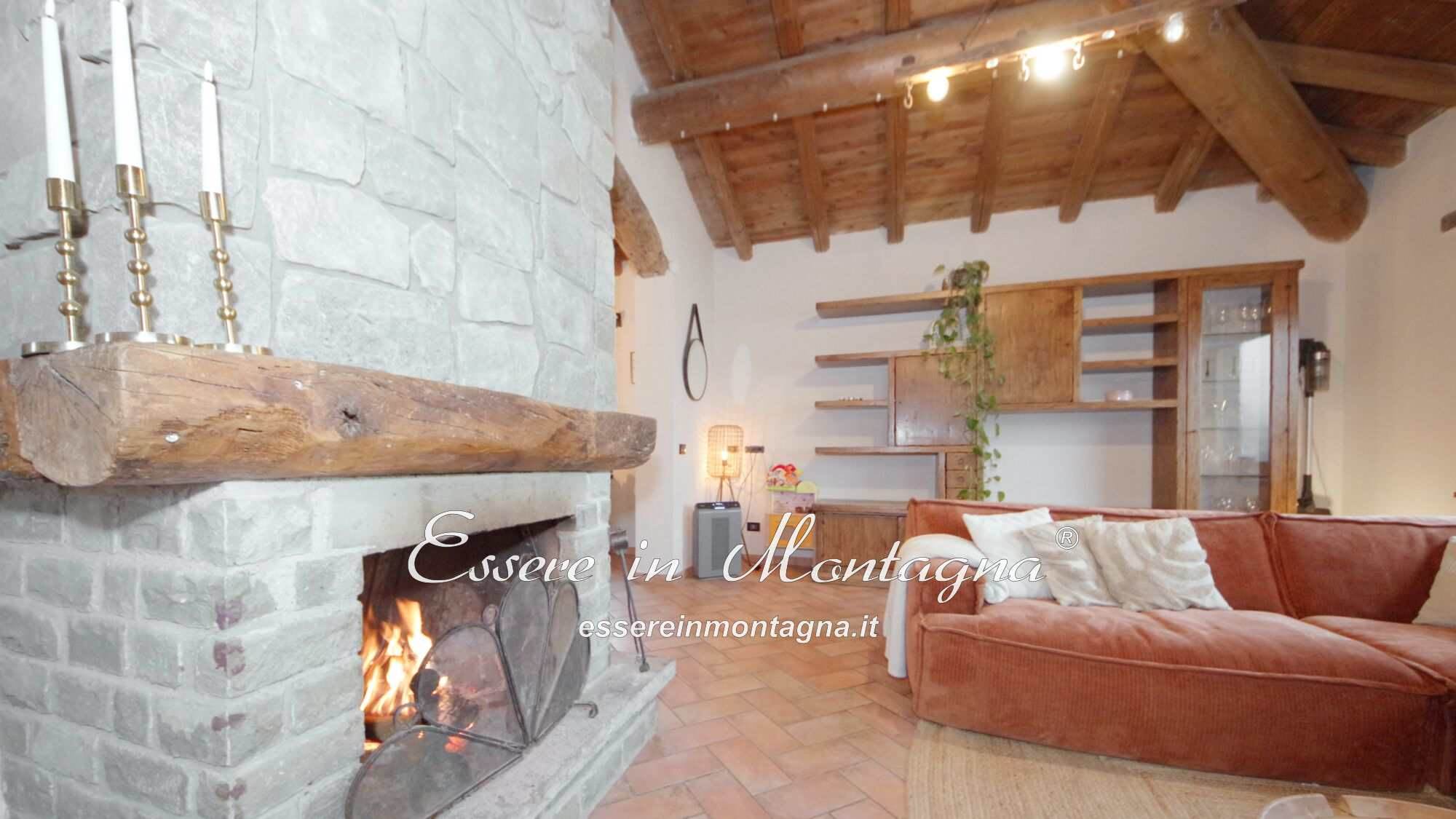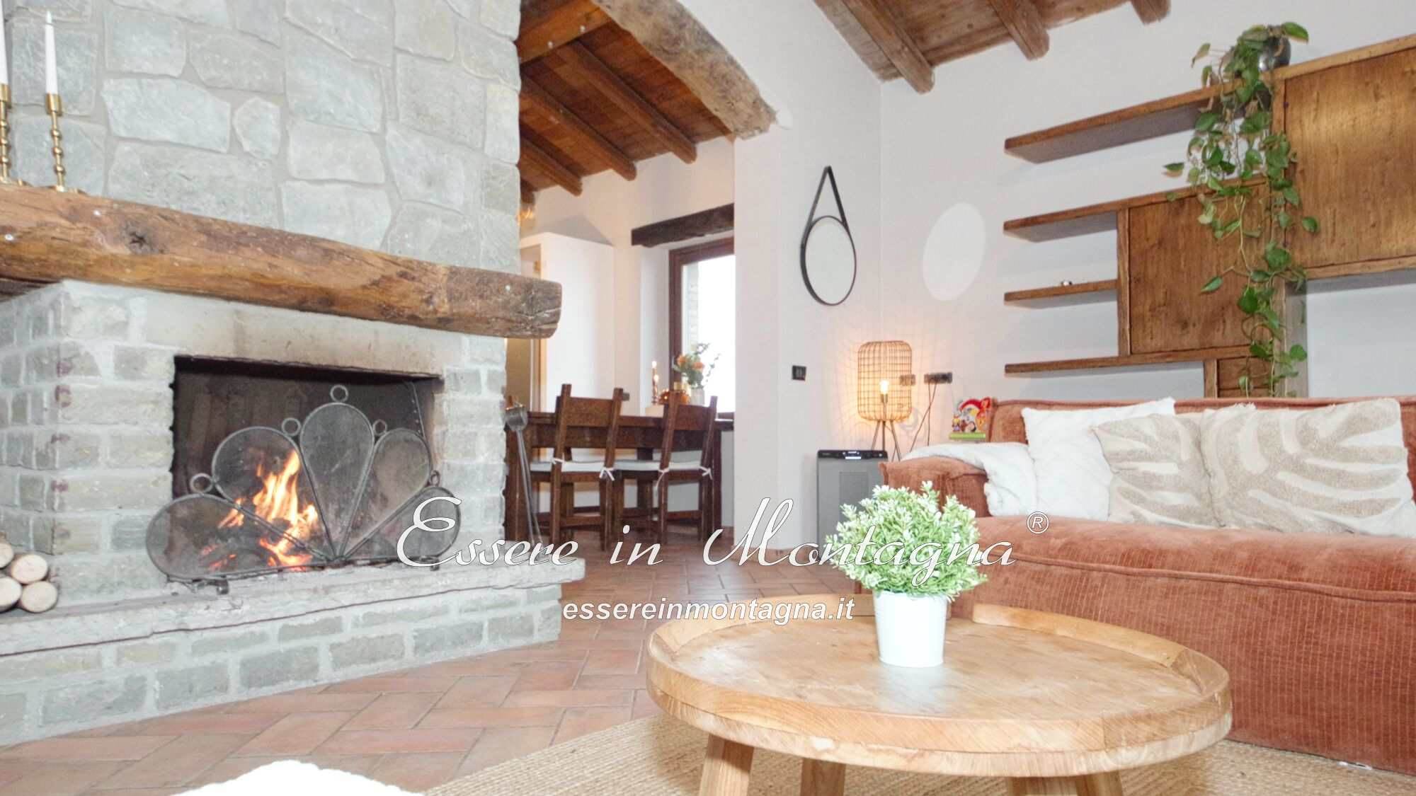 Entri e ti accoglie un grande open space con camino centrale, cucina aperta, tavolone conviviale, due camere generose e un bagno moderno.