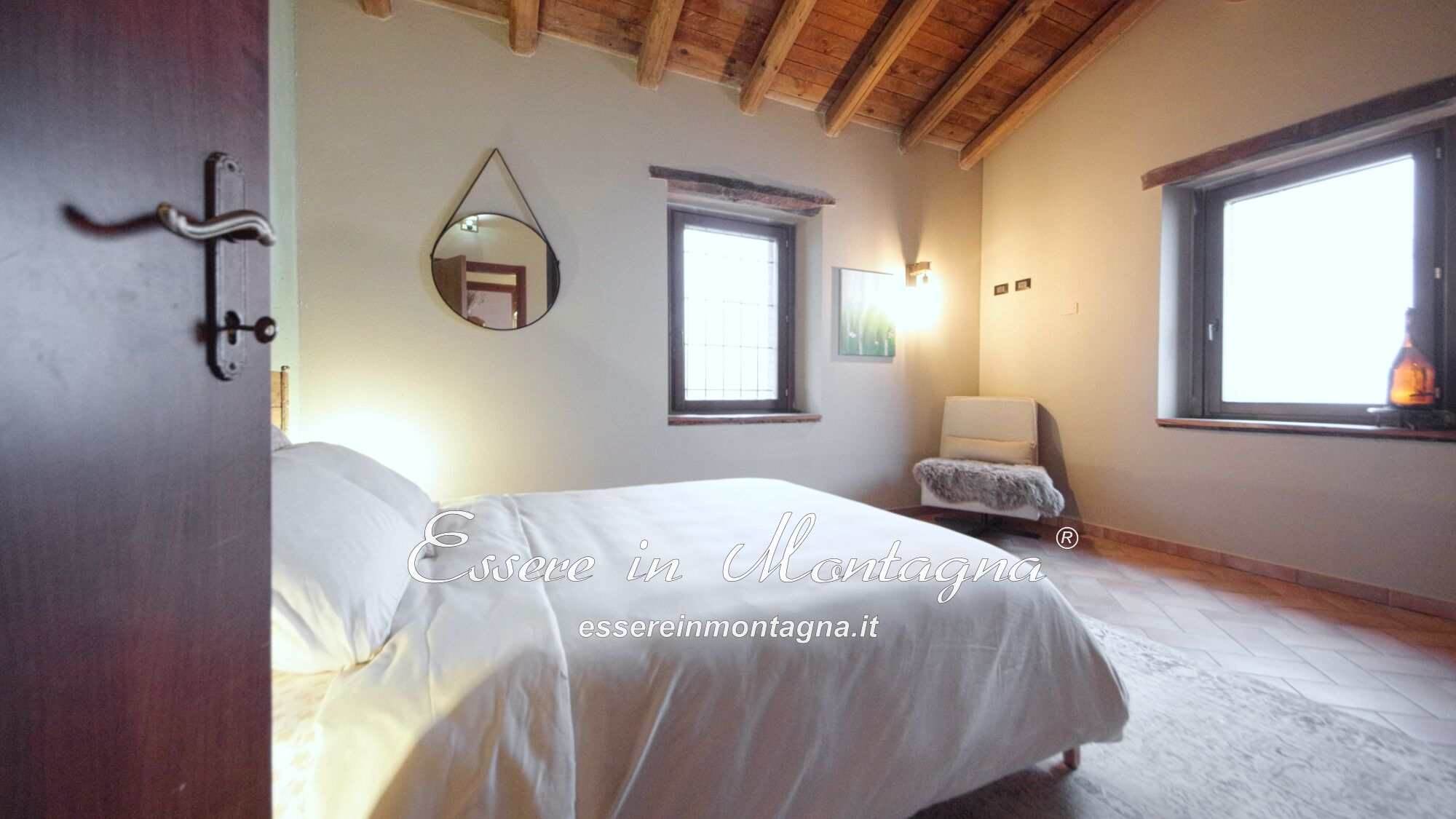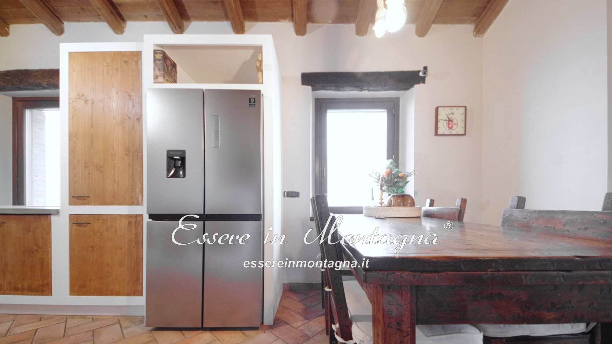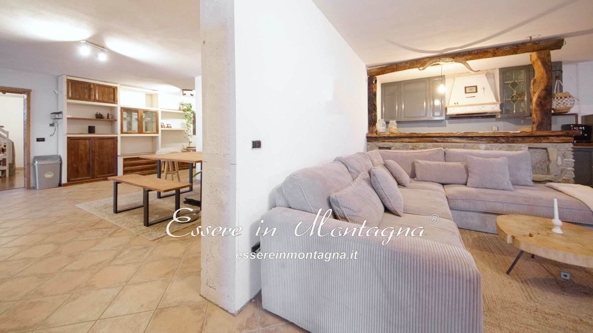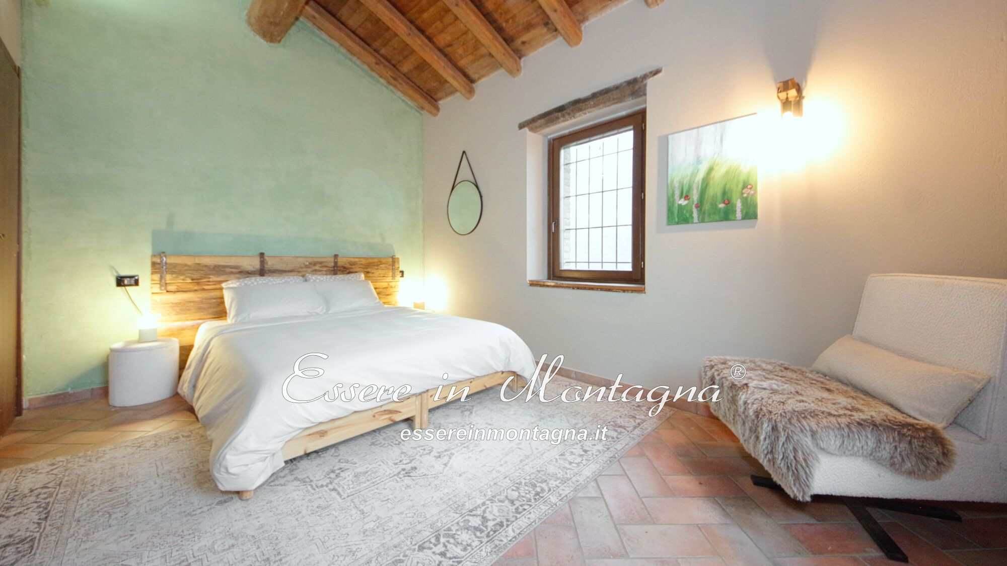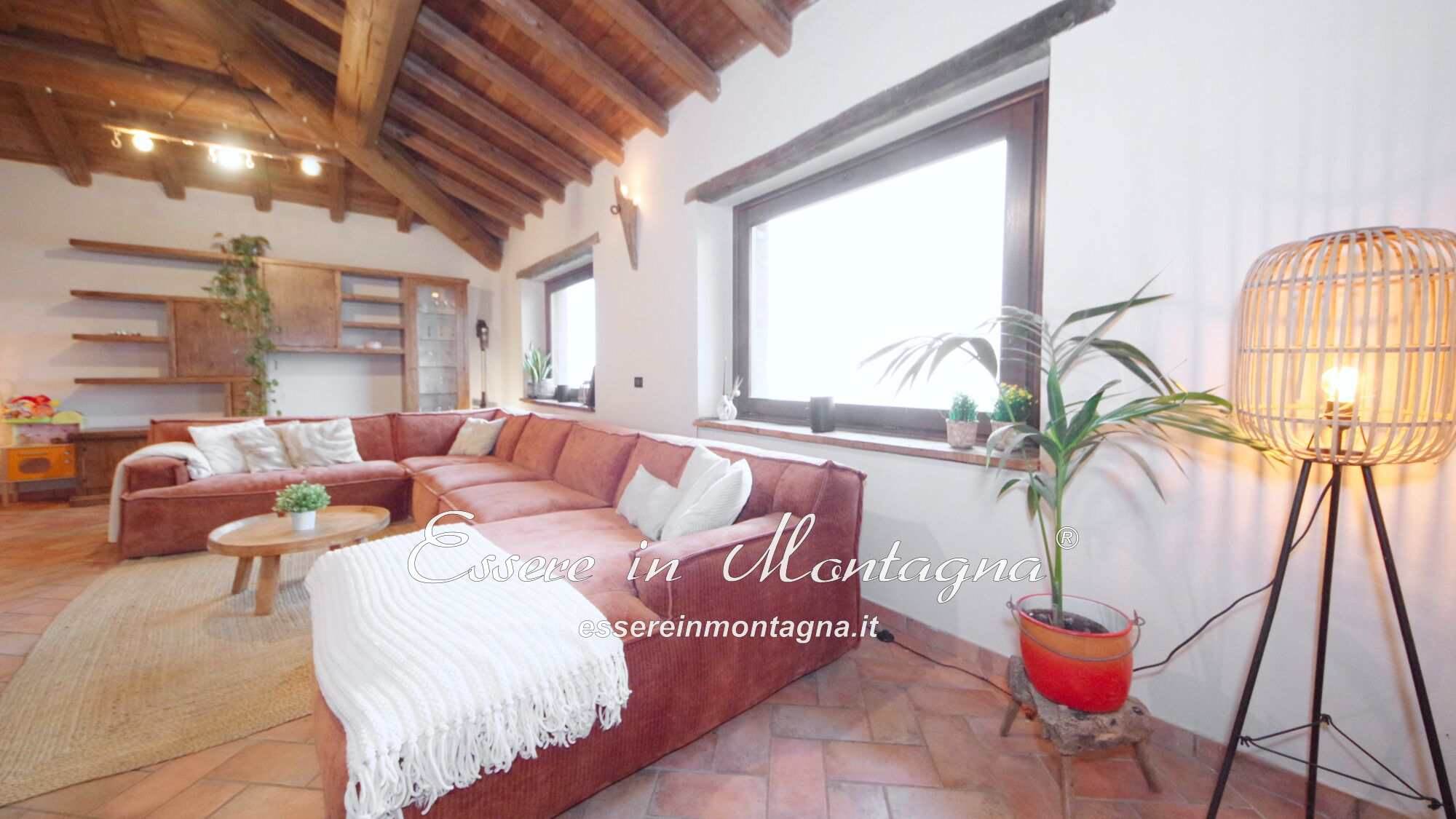 Entri e ti accoglie un grande open space con camino centrale, cucina aperta, tavolone conviviale, due camere generose e un bagno moderno.