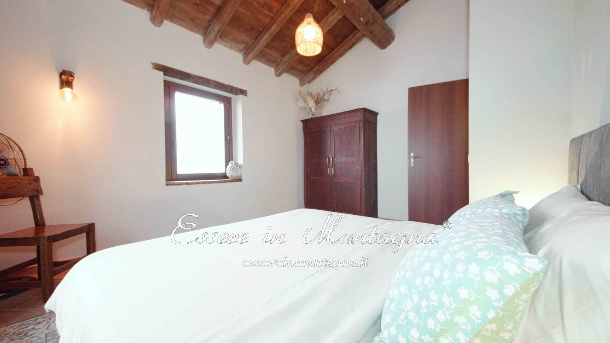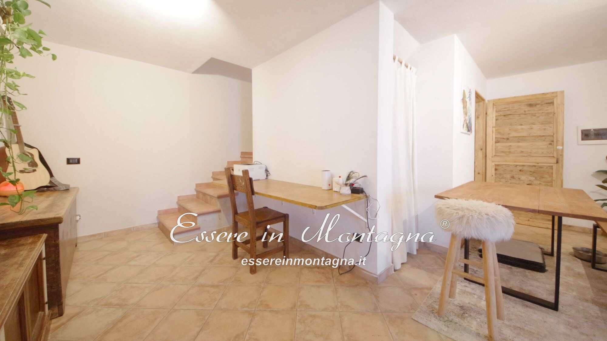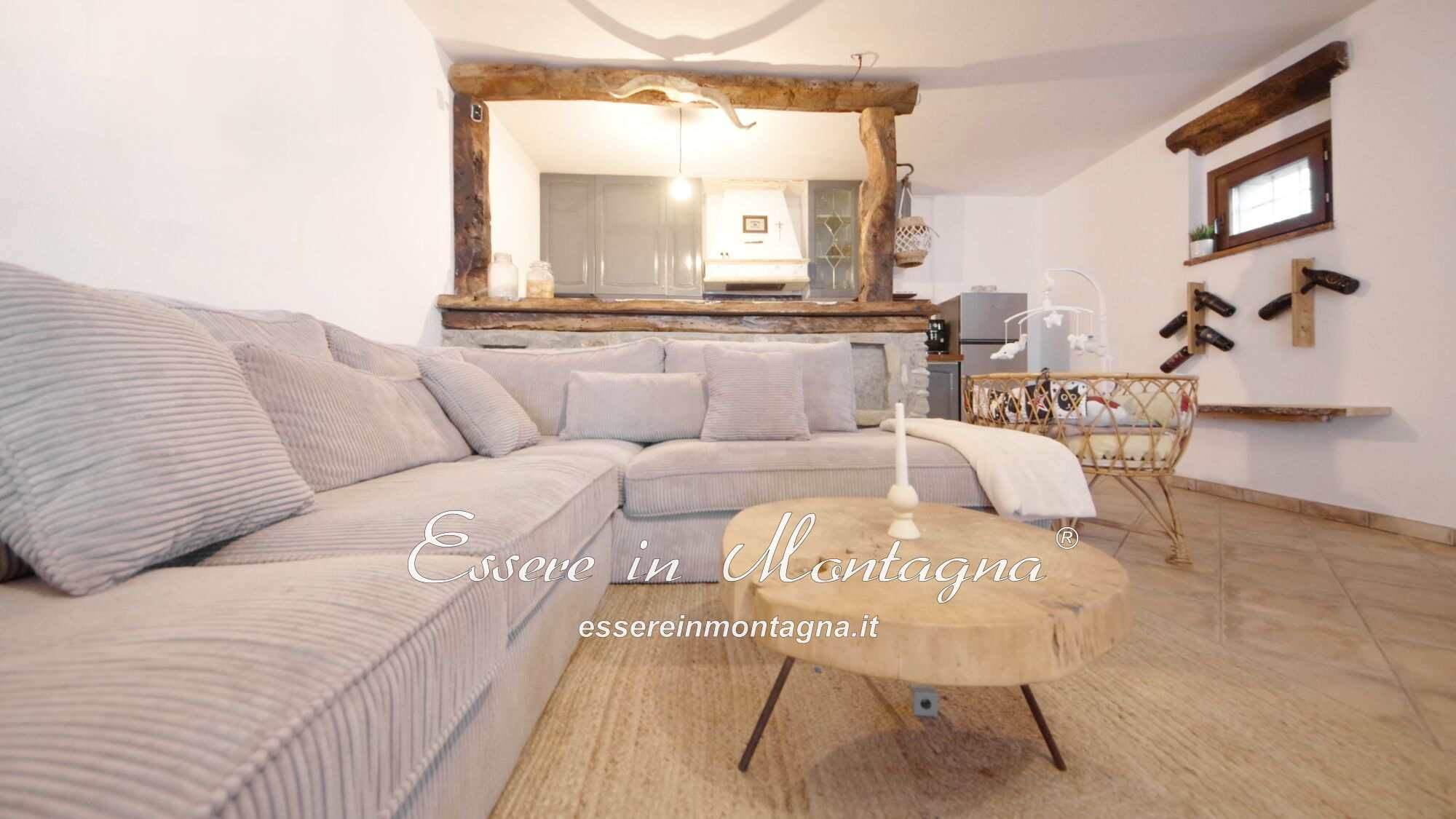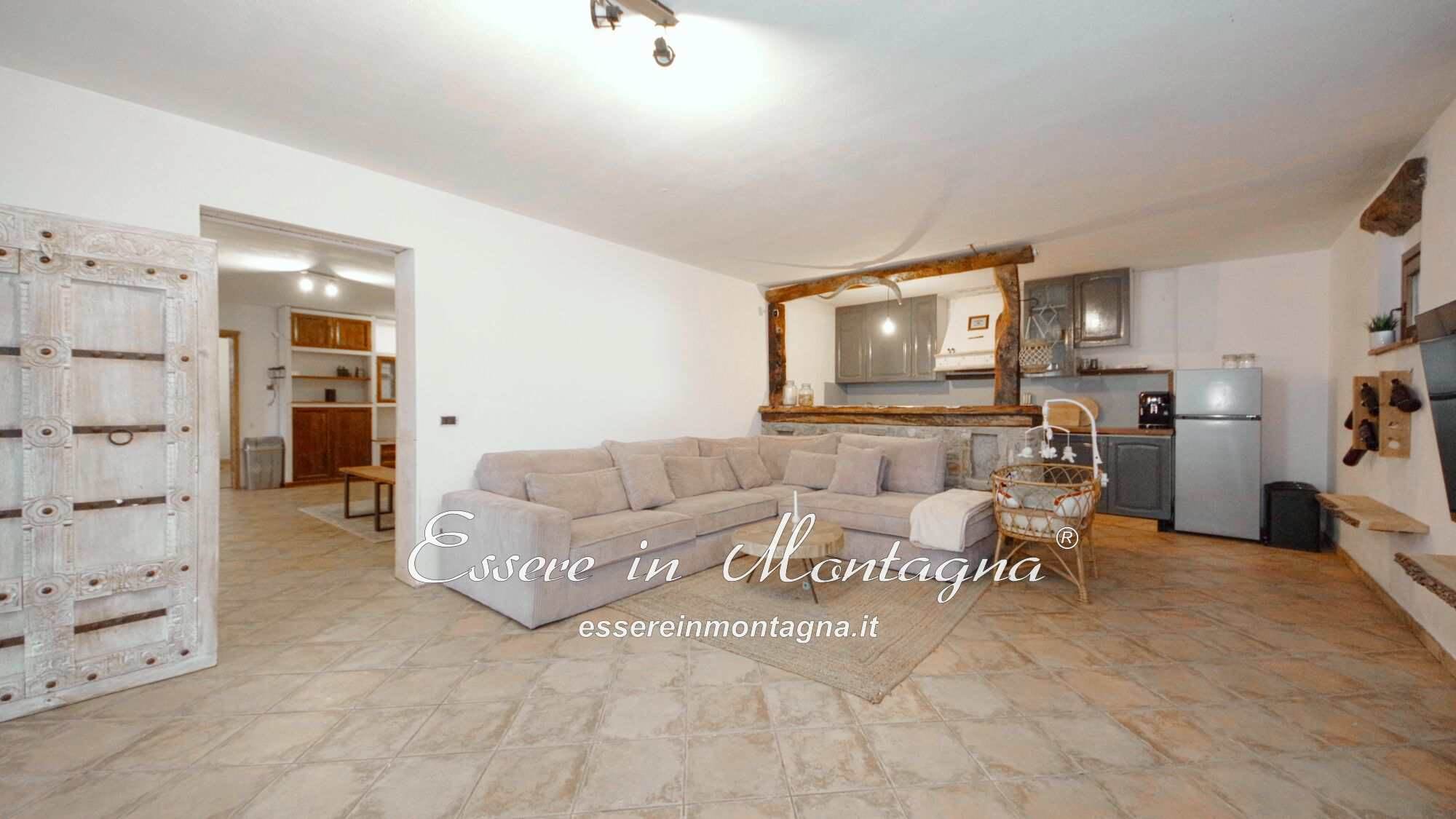 Entri e ti accoglie un grande open space con camino centrale, cucina aperta, tavolone conviviale, due camere generose e un bagno moderno.