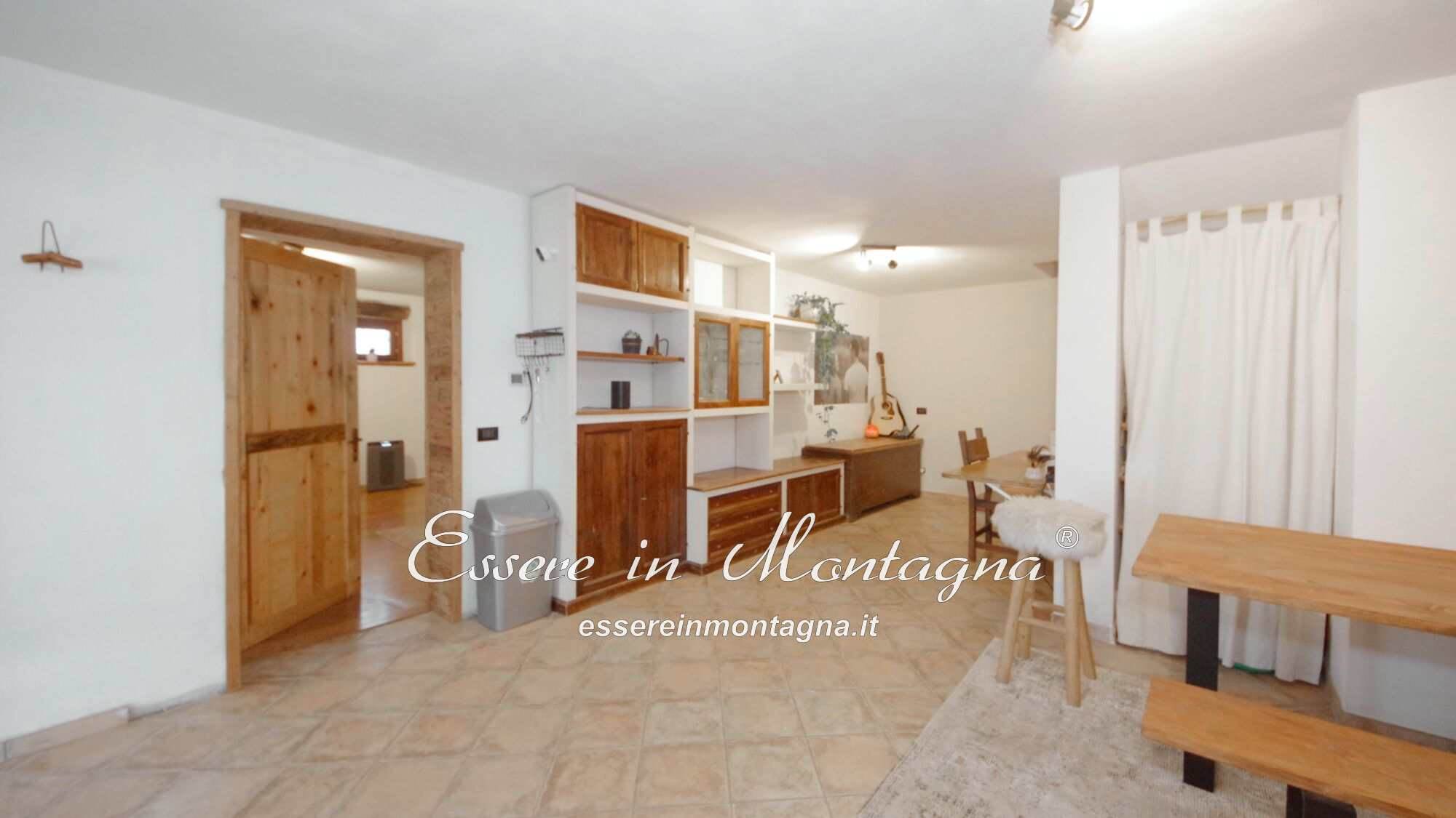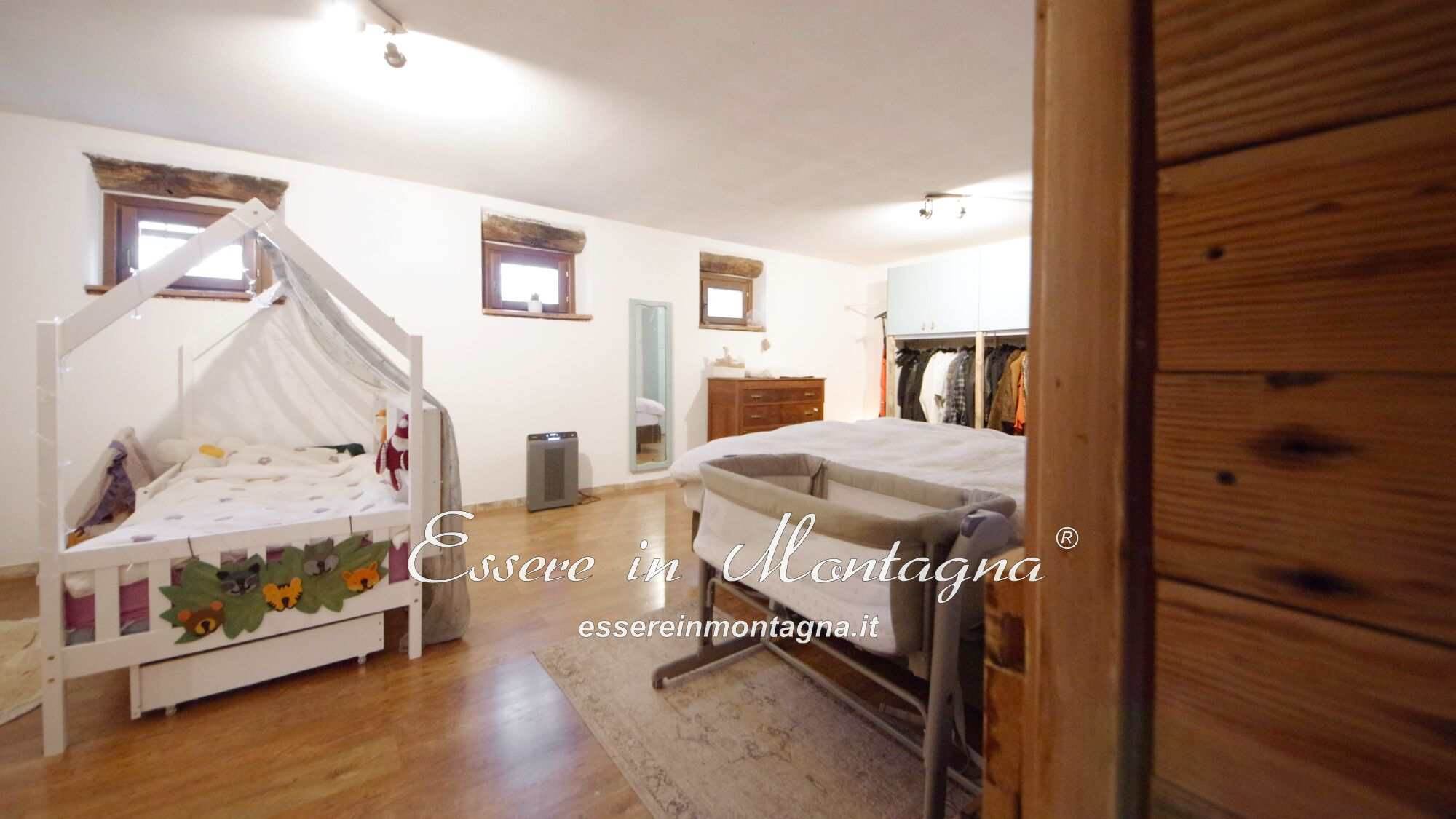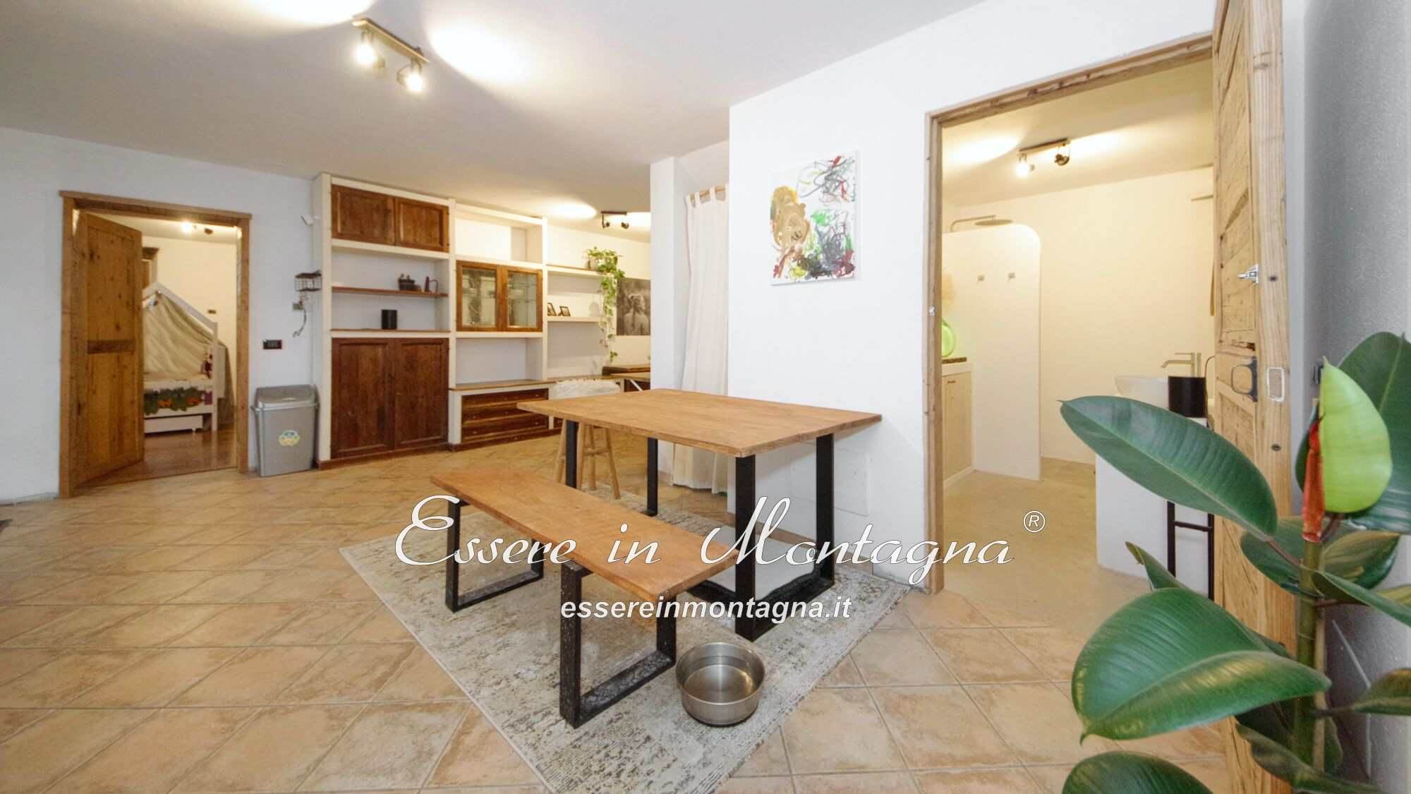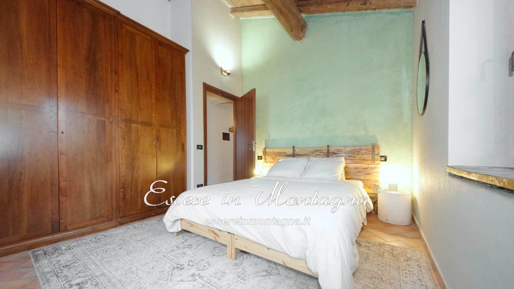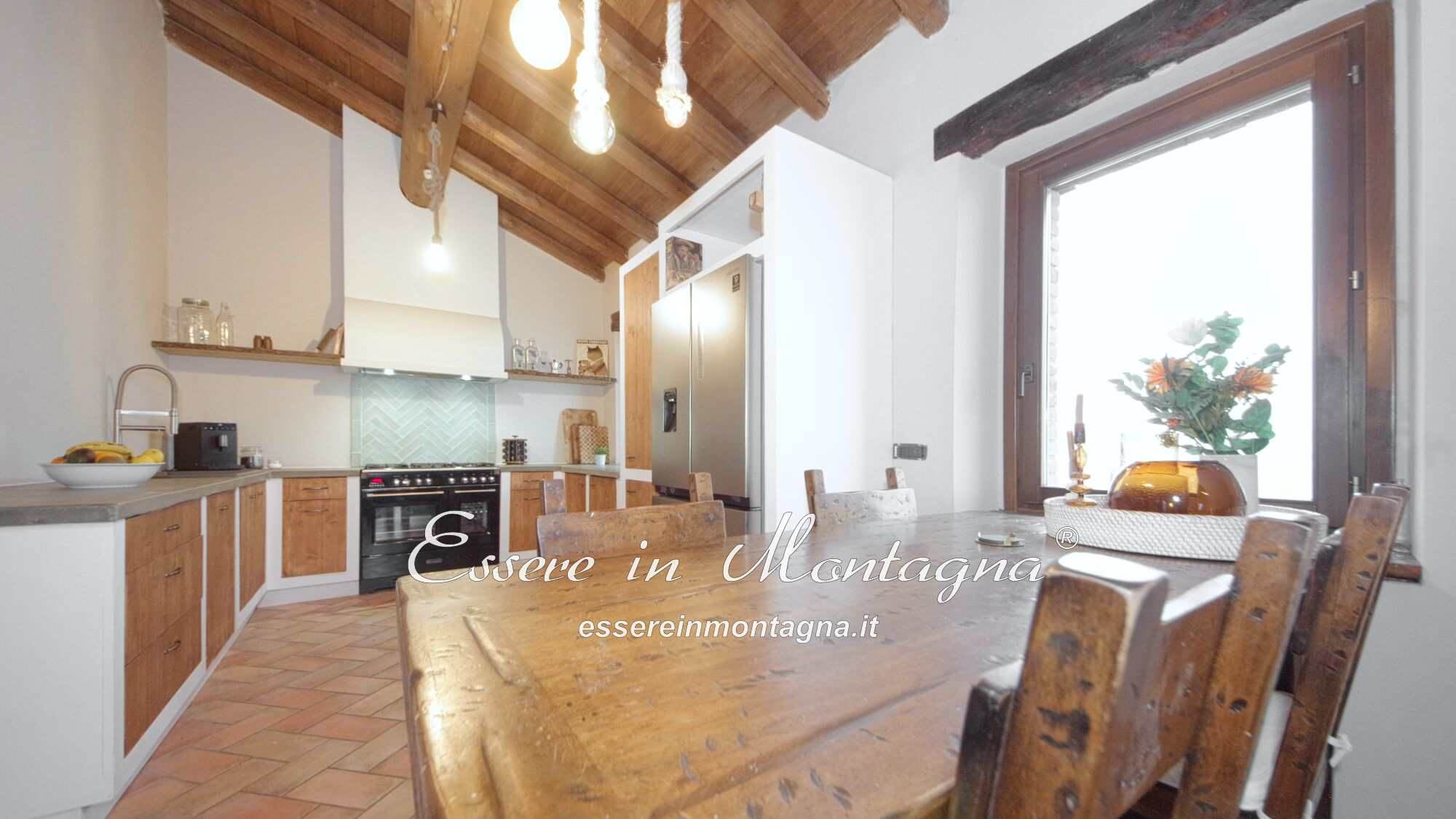 Entri e ti accoglie un grande open space con camino centrale, cucina aperta, tavolone conviviale, due camere generose e un bagno moderno.