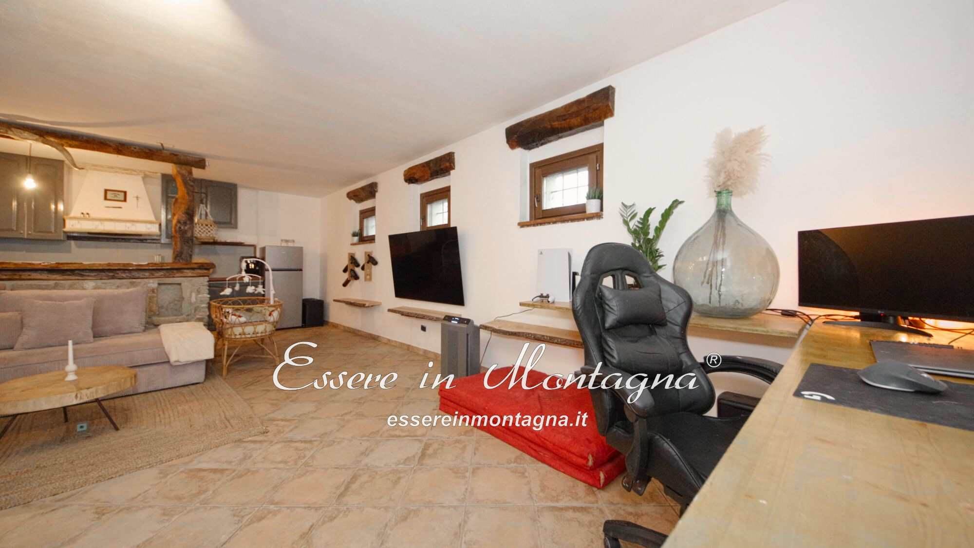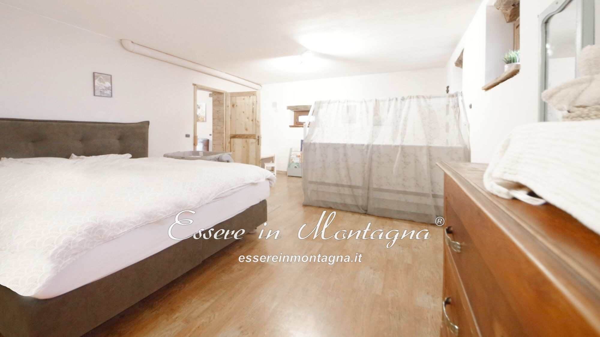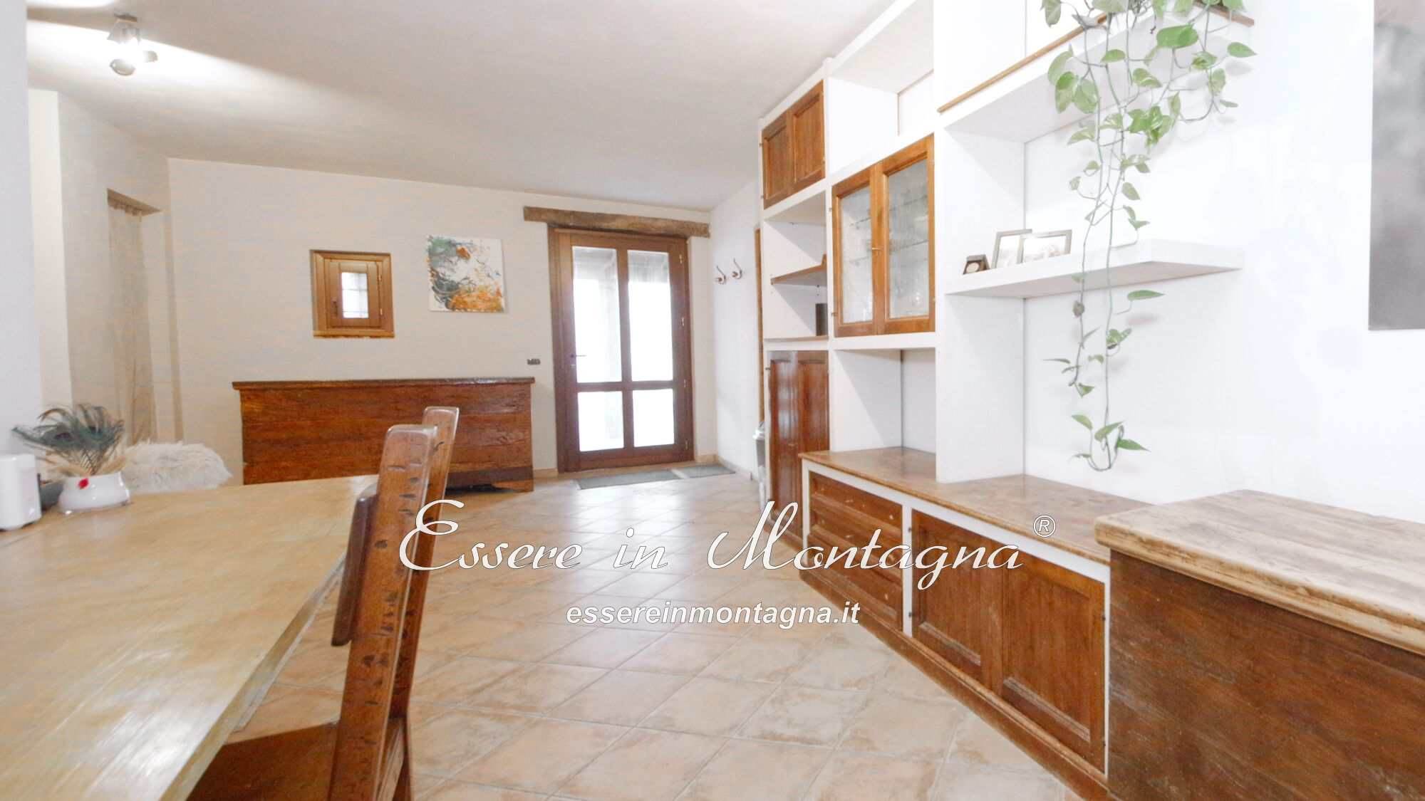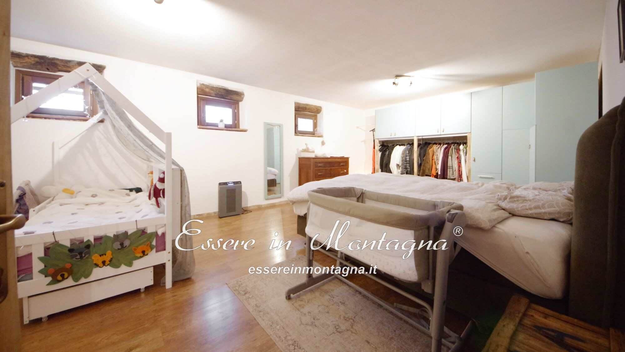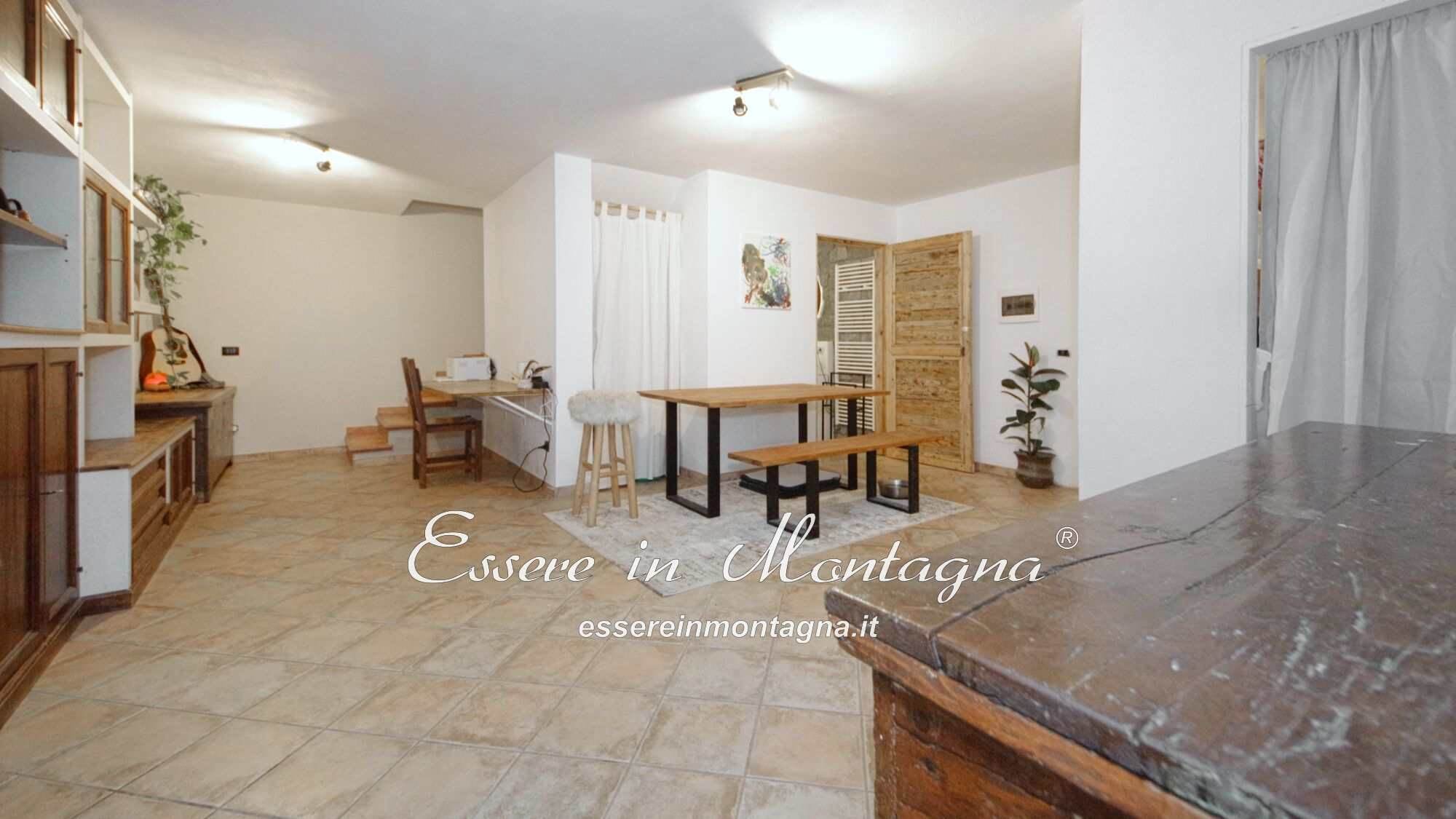 Entri e ti accoglie un grande open space con camino centrale, cucina aperta, tavolone conviviale, due camere generose e un bagno moderno.