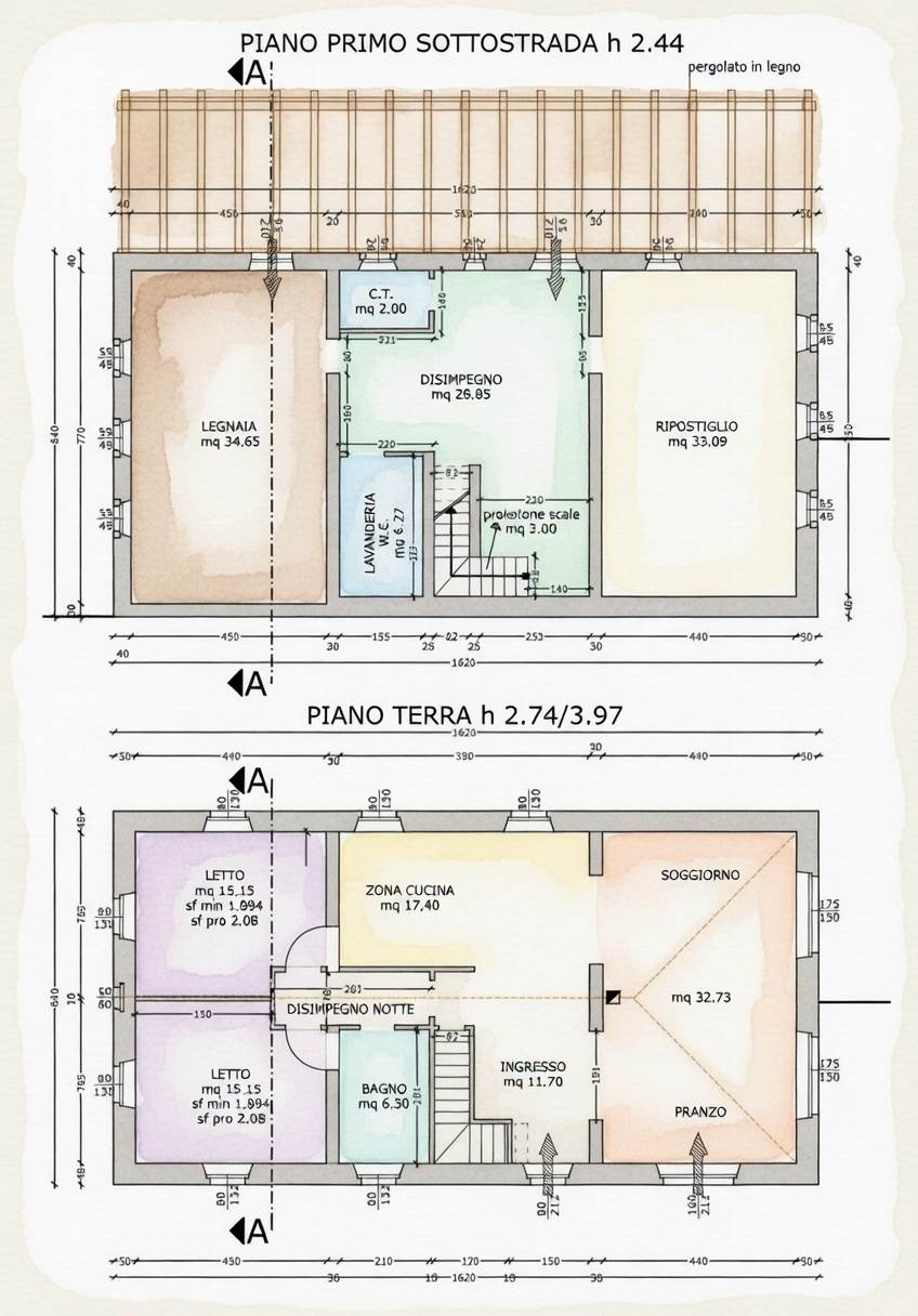 Poi scendi la scala larga e trovi un disimpegno trasformato in zona polivalente, la taverna che affaccia sul portico di 64 mq (che te lo dico a fare…), un’altra camera grande e un bagno con doccia a pavimento.